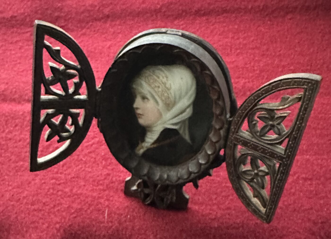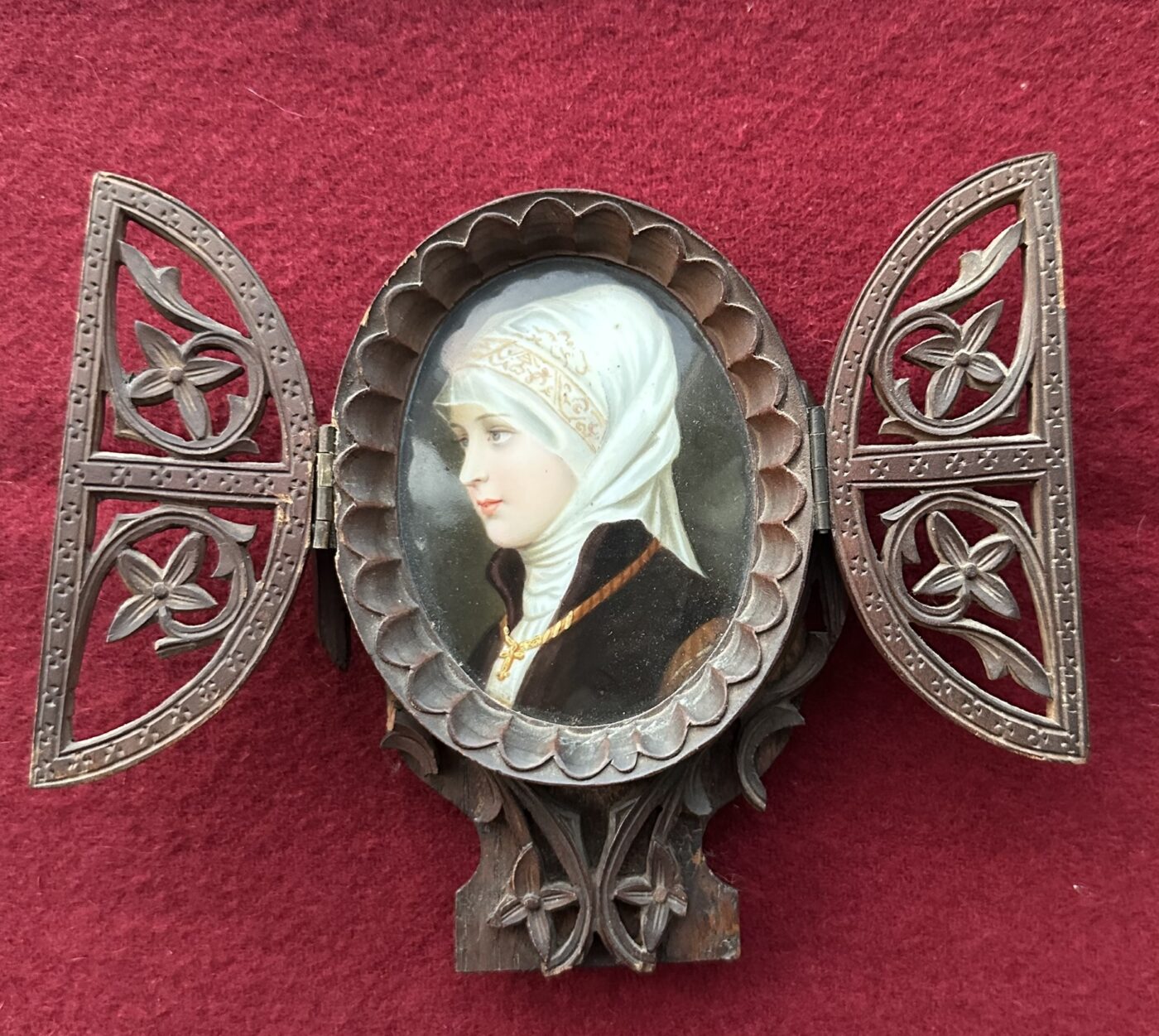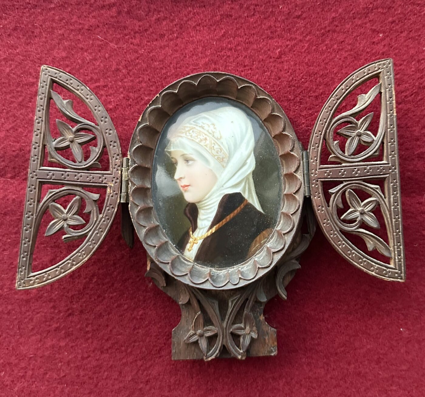A beautiful portrait miniature painted on an oval porcelain plaque of a young woman contained in a very ornate easel back carved wooden frame. A unique little piece of bijouterie. Ht 13, W 15.5 cms.
