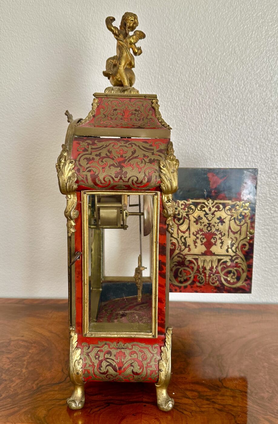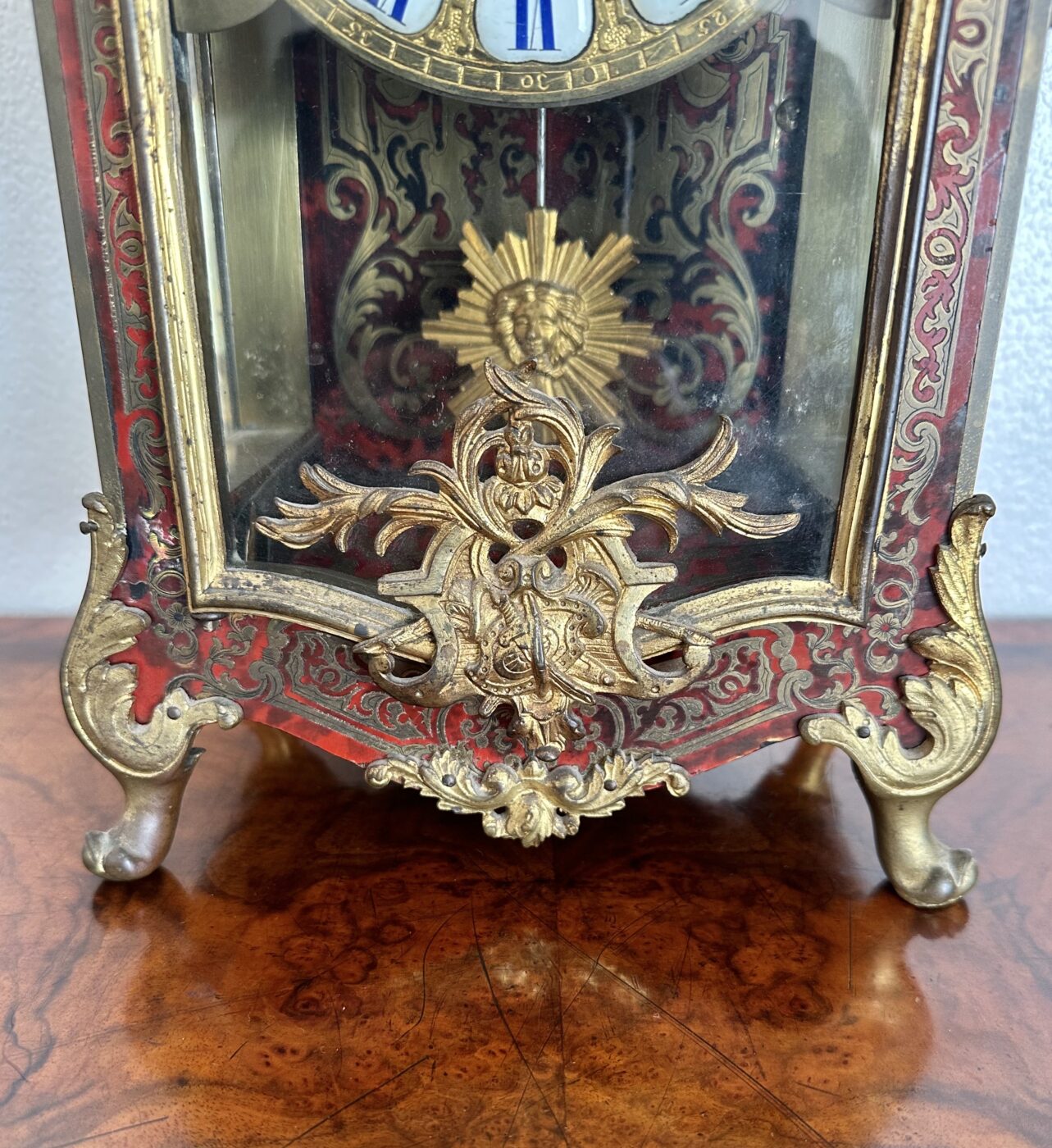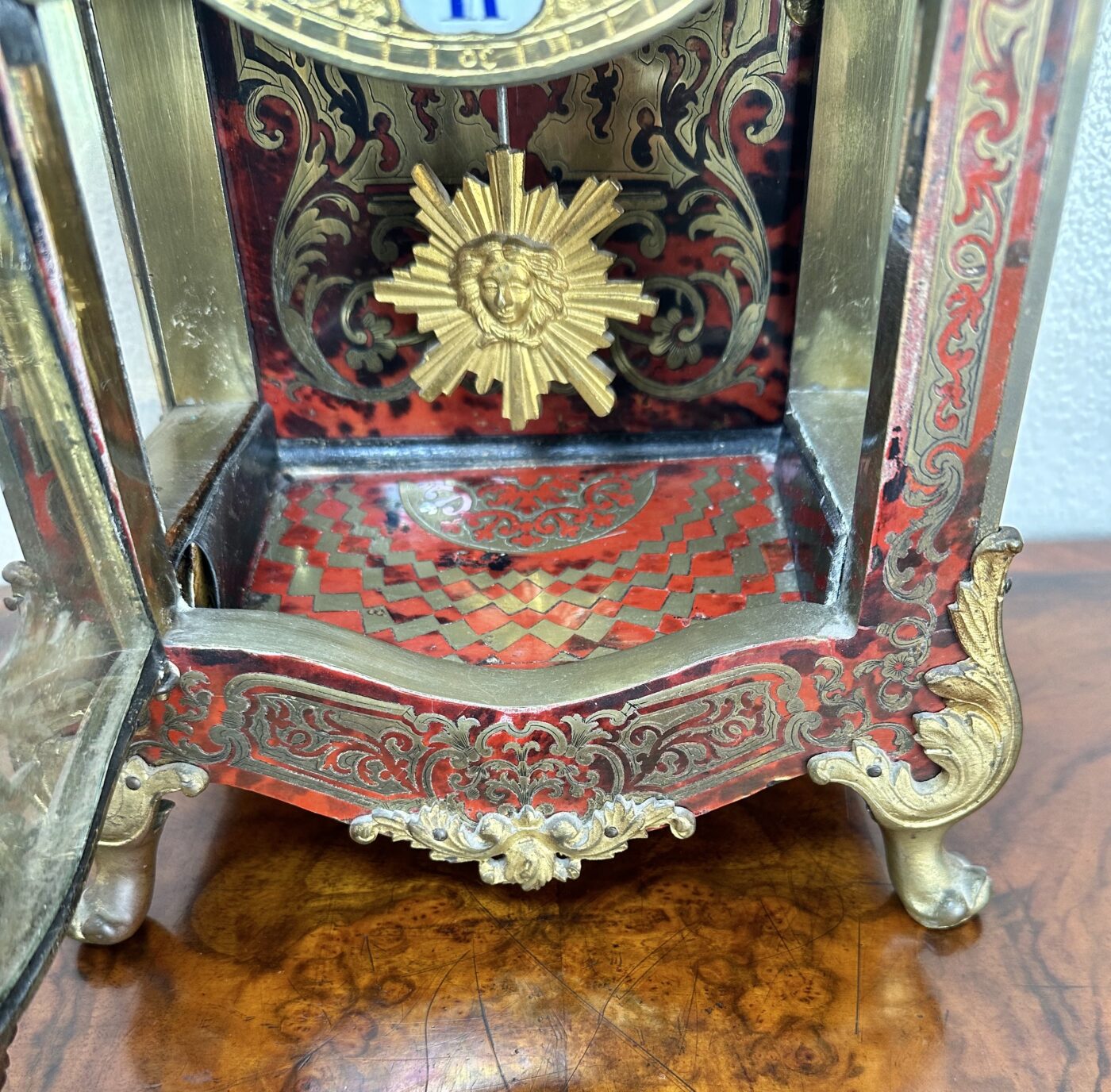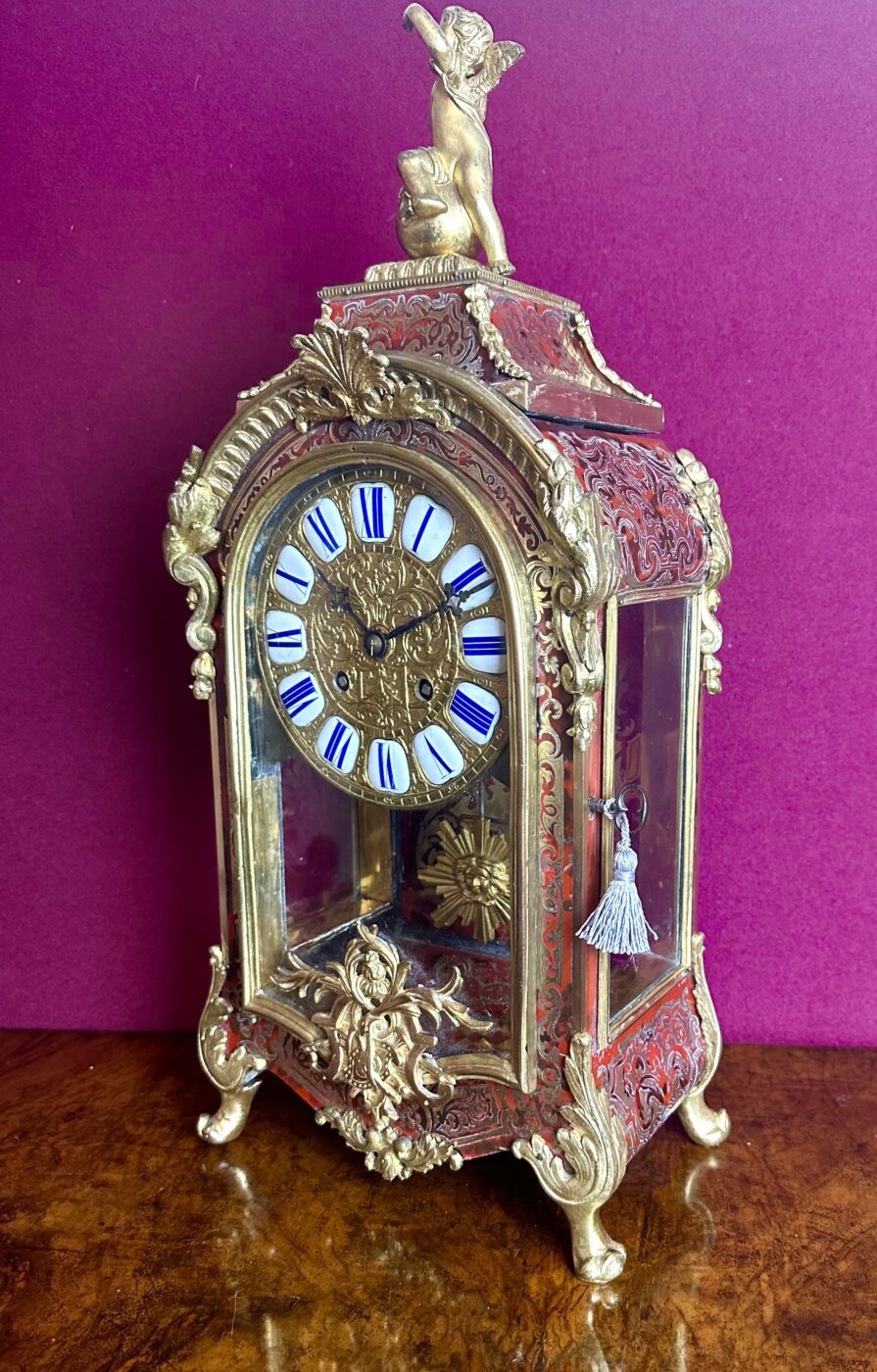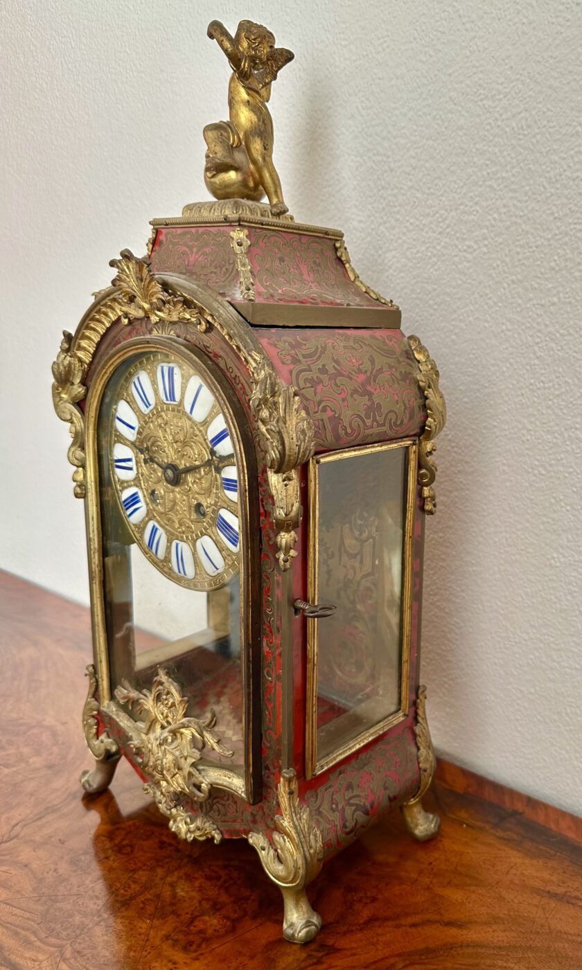 A fine decorative mantle clock. The movement of 8-day duration, striking the hours and half hours on a cast bell giving a lovely mellow chime. This clock is offered in the rare and highly sort after original condition, without losses, additions or lifting veneers. Ht 57, W 23, D 13 cms
