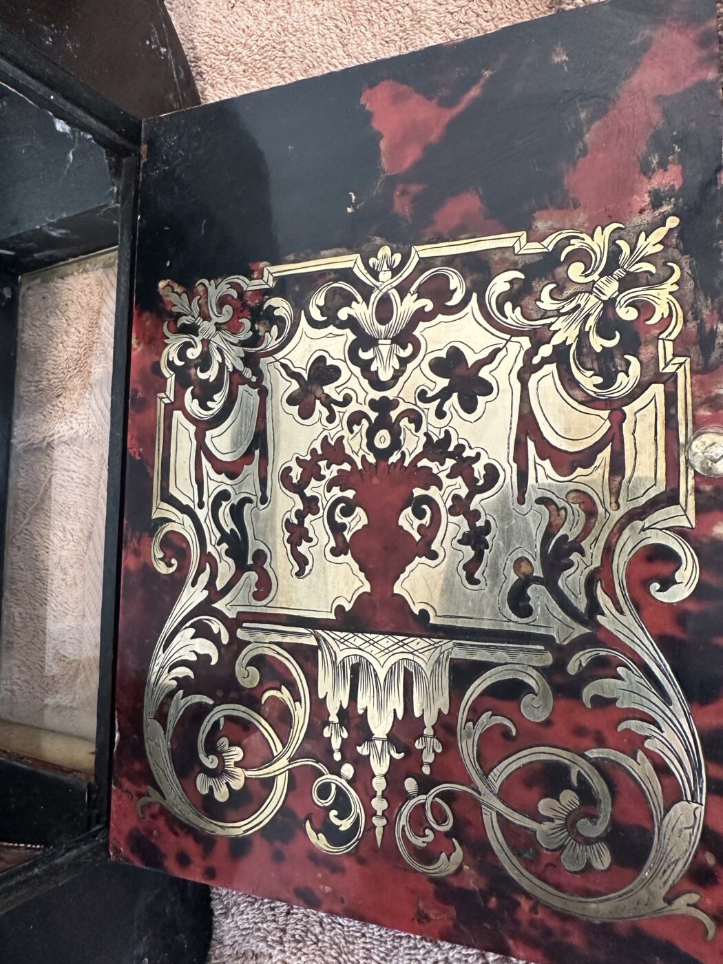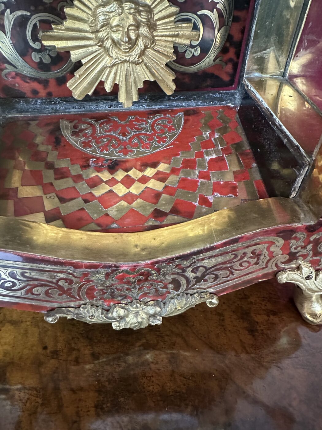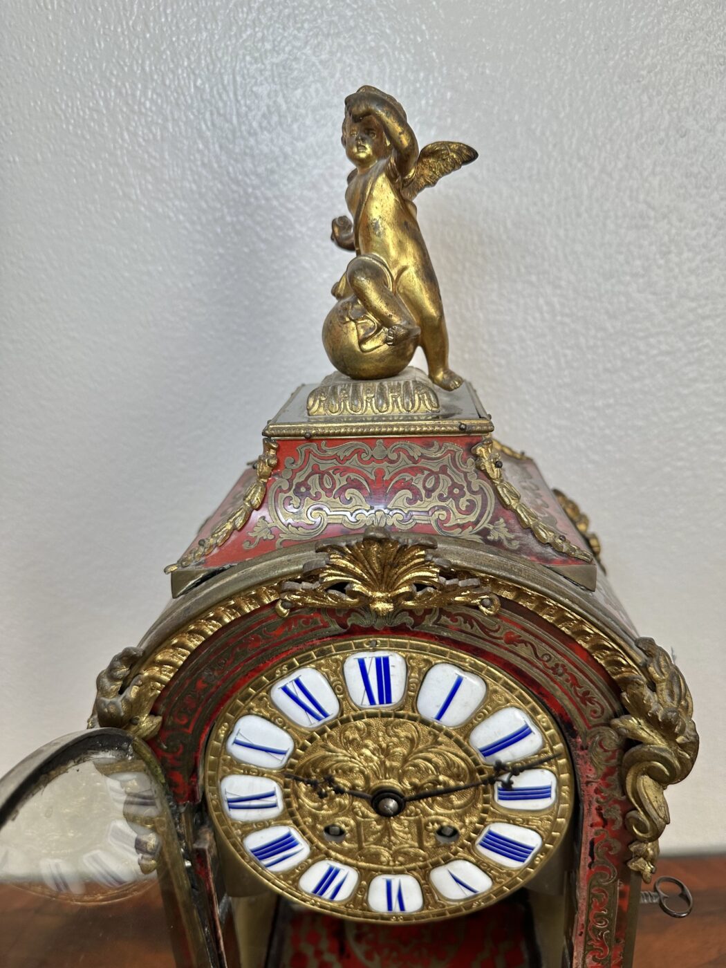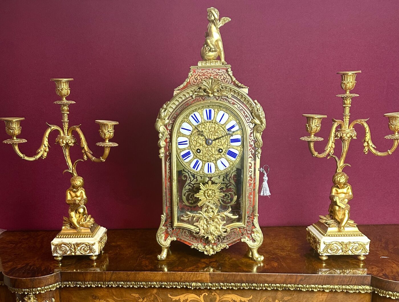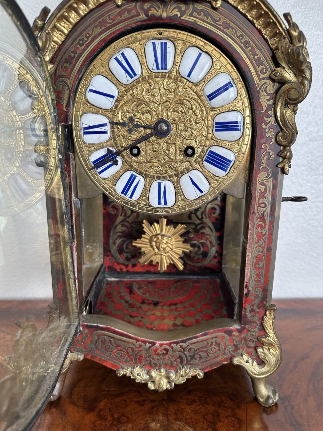 A fine decorative mantle clock. The movement of 8-day duration, striking the hours and half hours on a cast bell giving a lovely mellow chime. This clock is offered in the rare and highly sort after original condition, without losses, additions or lifting veneers. Ht 57, W 23, D 13 cms