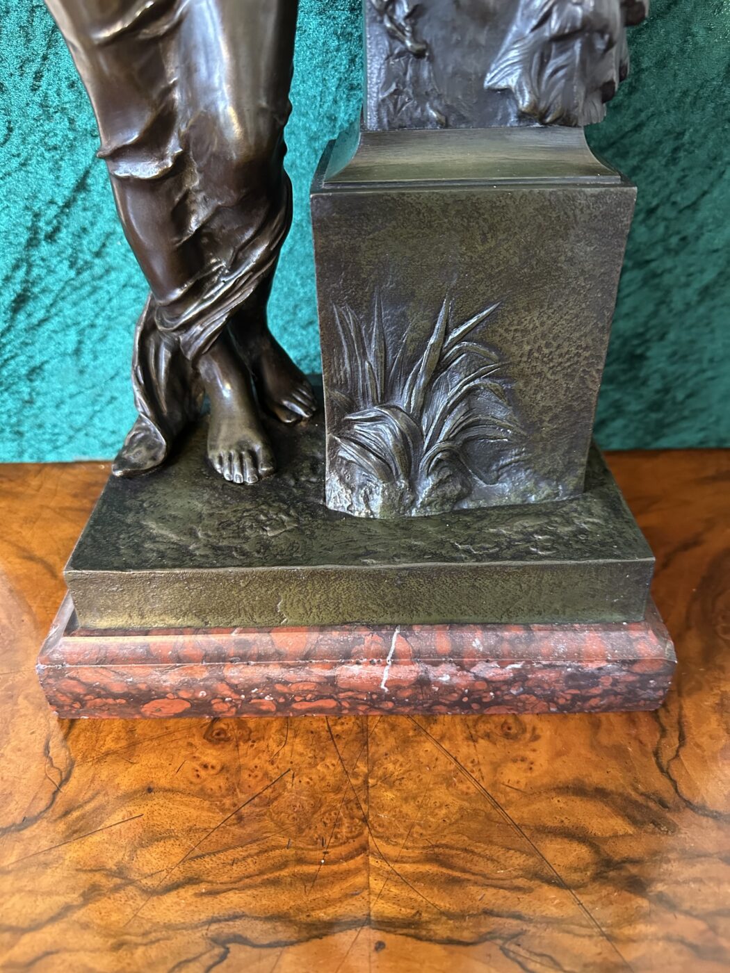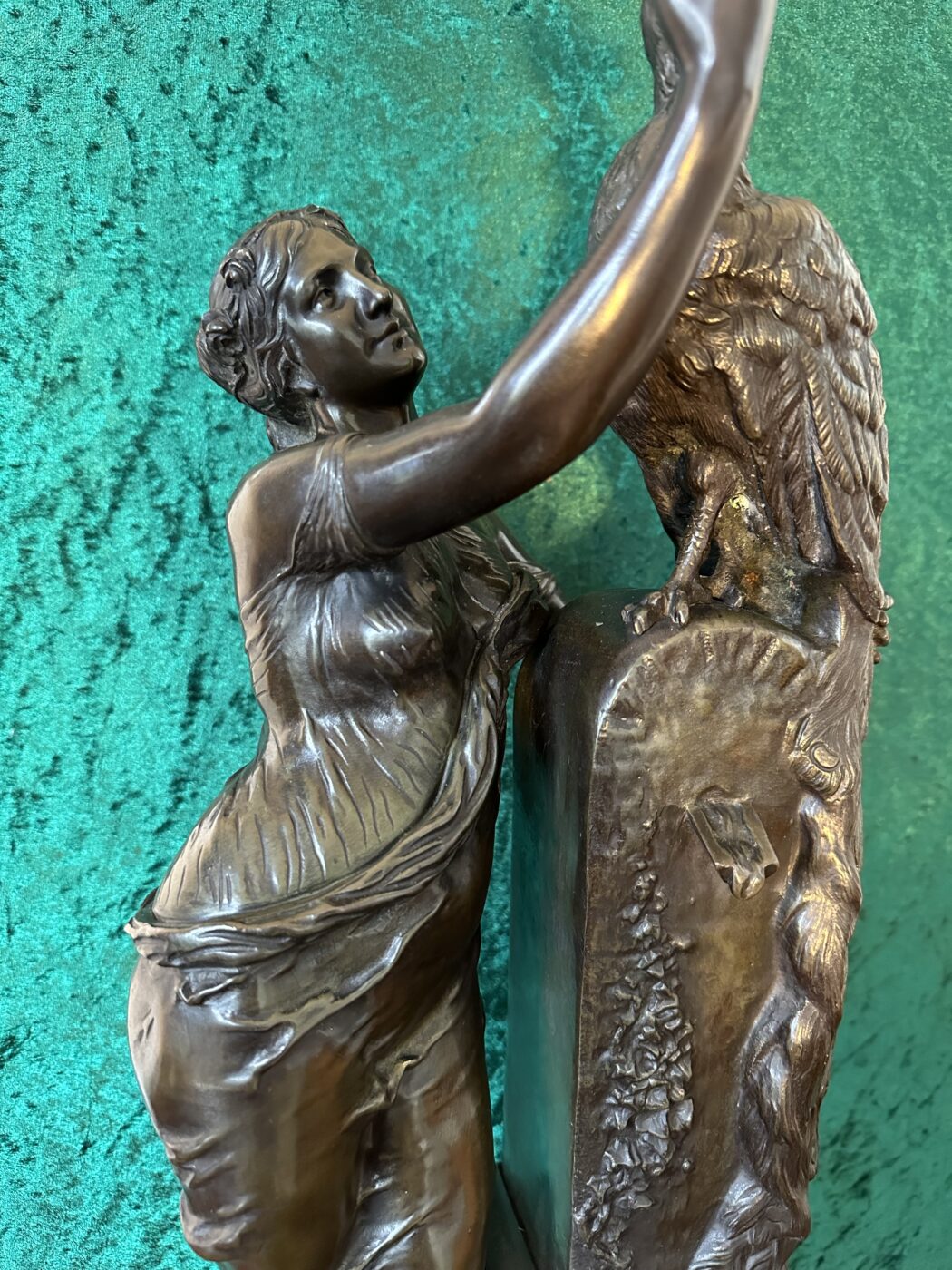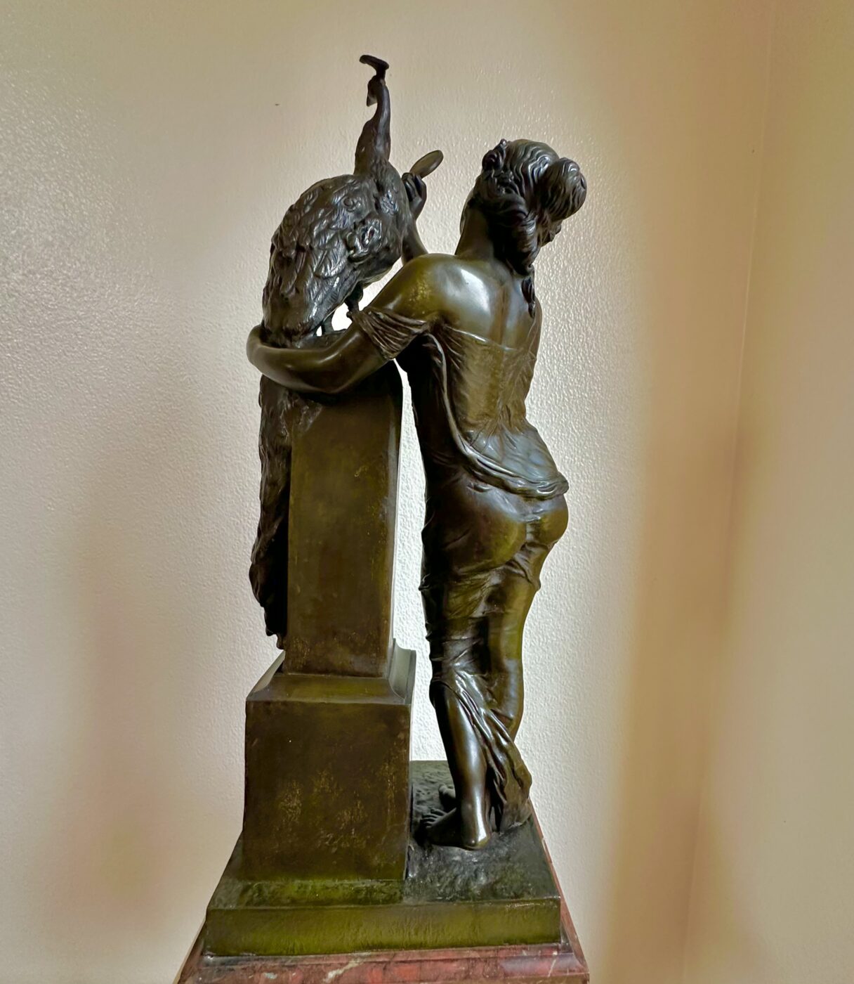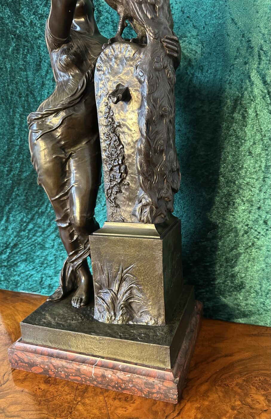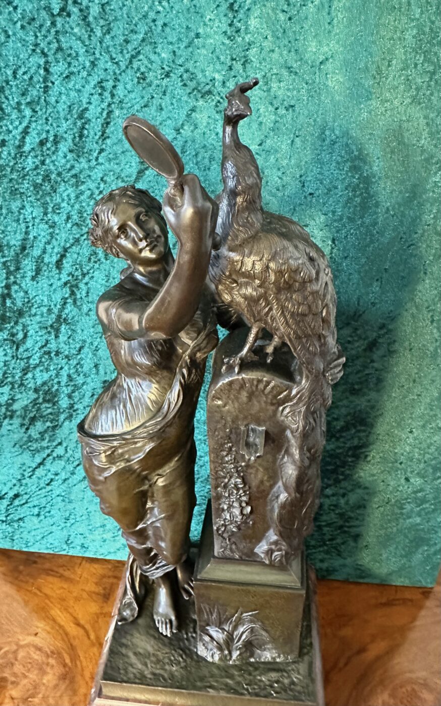 Most decorative & stunning bronze, signed Henri Louis Levasseur, of a beautiful young woman in a translucent dress, standing by a fountain. Presenting a hand mirror to a peacock, reflecting how beautiful he is. This is a very detailed and most decorative sculpture. Ht 58, W 23, D 18 cms