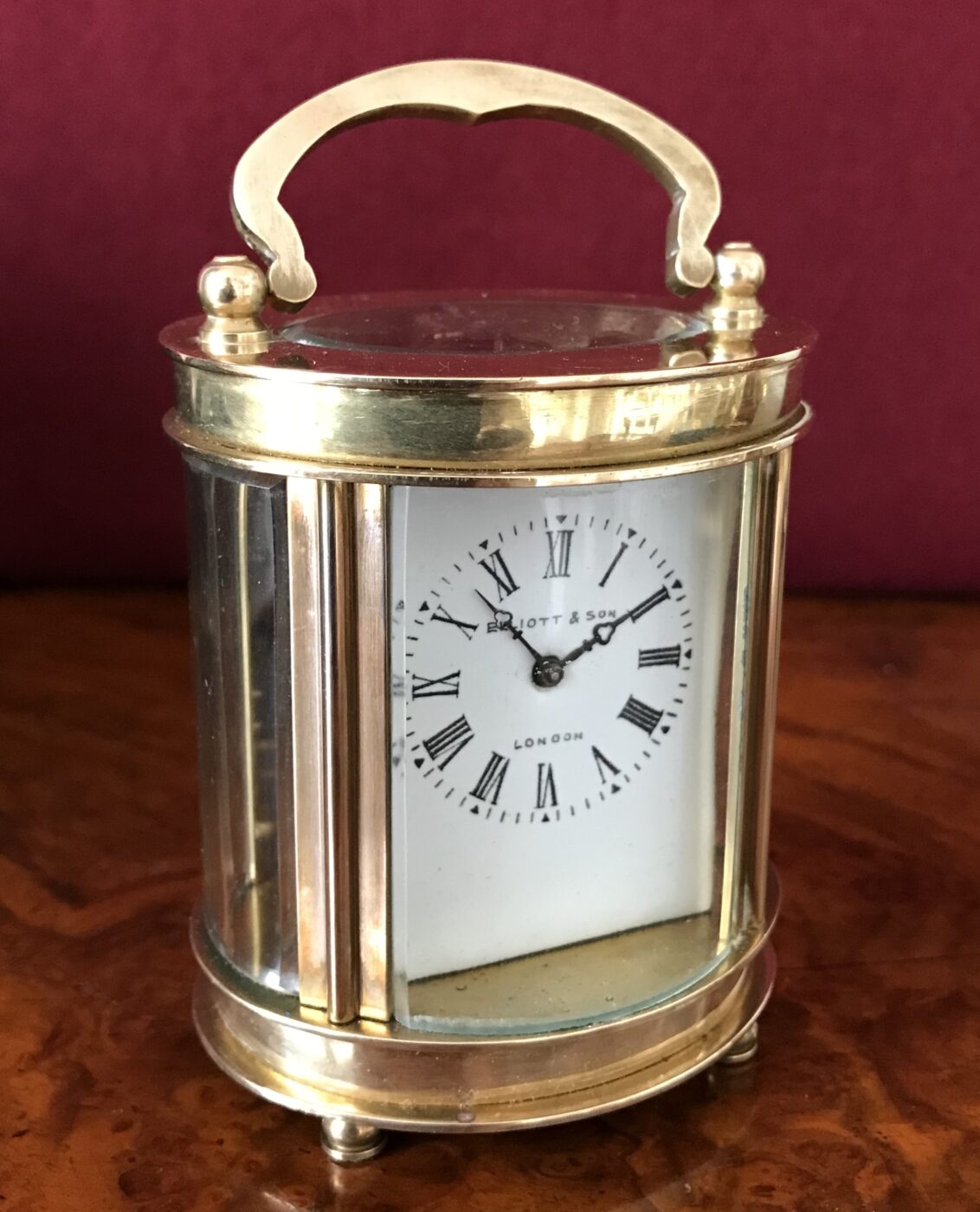 An interesting Miniature carriage clock circa 1930 of rare outline, the bevelled 5 glass case enclosing an 8 day movement with enamel dial inscribed Elliot & Son London. A unique little carriage clock of miniature proportions, which would suit a variety of rooms. Ht 8, W 7, D 7 cms.