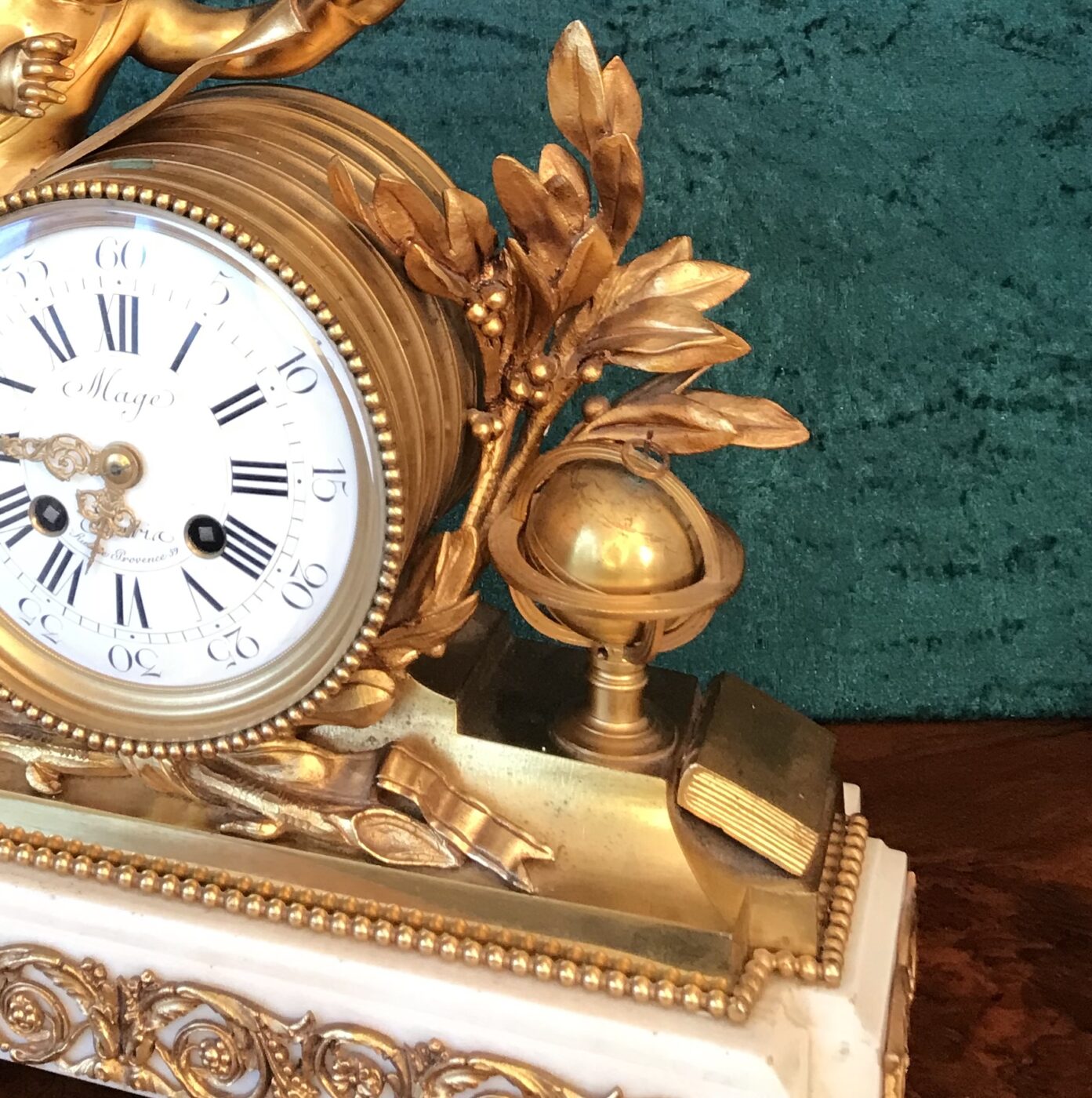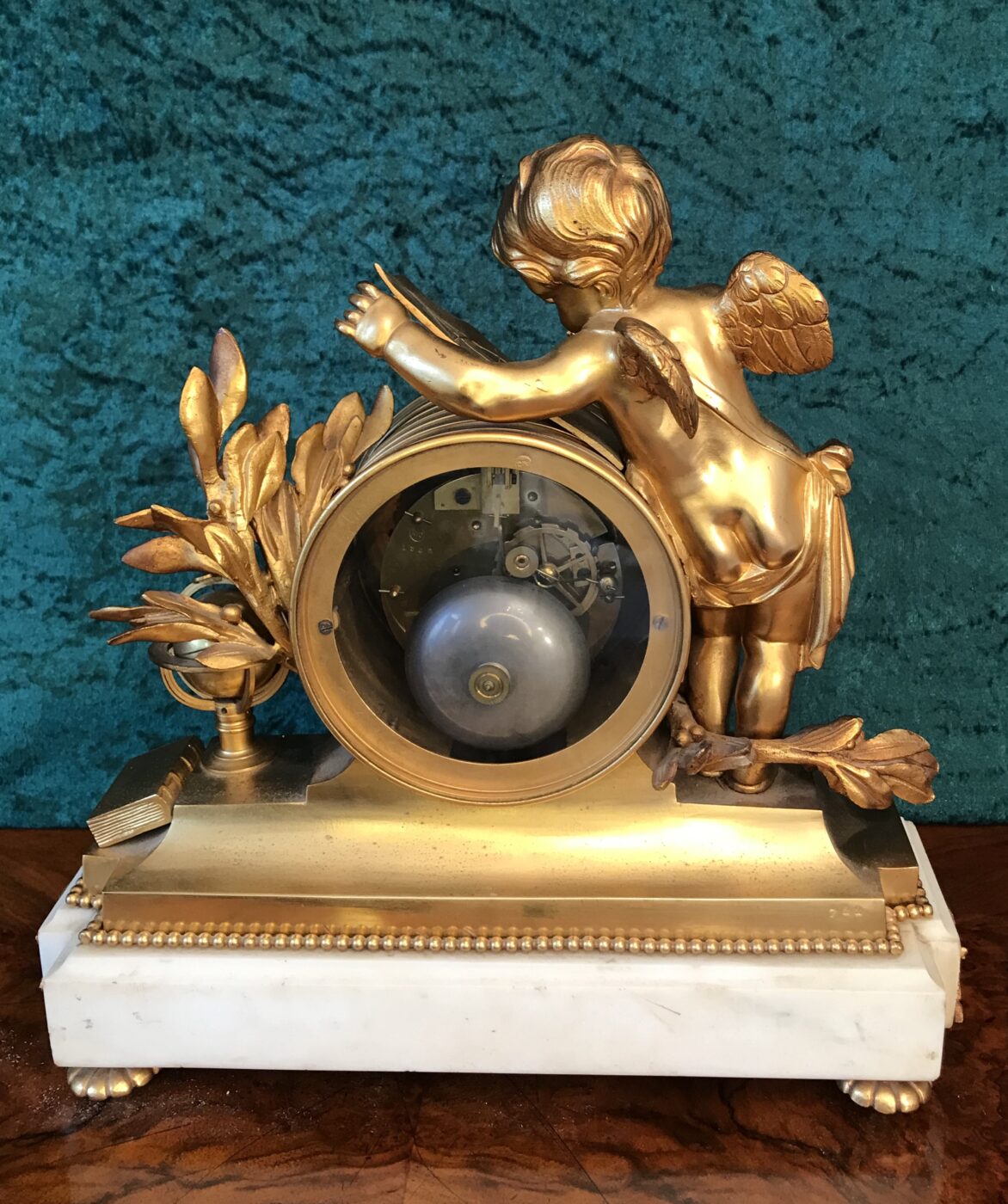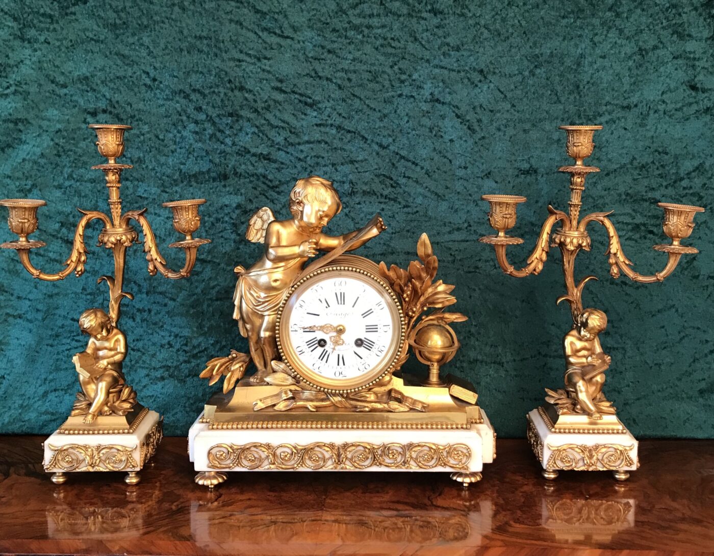 A truly outstanding clock set, the eight day movement striking the hours and half hours on a cast bell giving a lovely mellow chime. The case surmounted by a cherub over an enamel dial with Roman and Arabic numerals. The accompanying candelabra 37 cms with further studious cherubs. Ht 32, W 34, D 13 cms