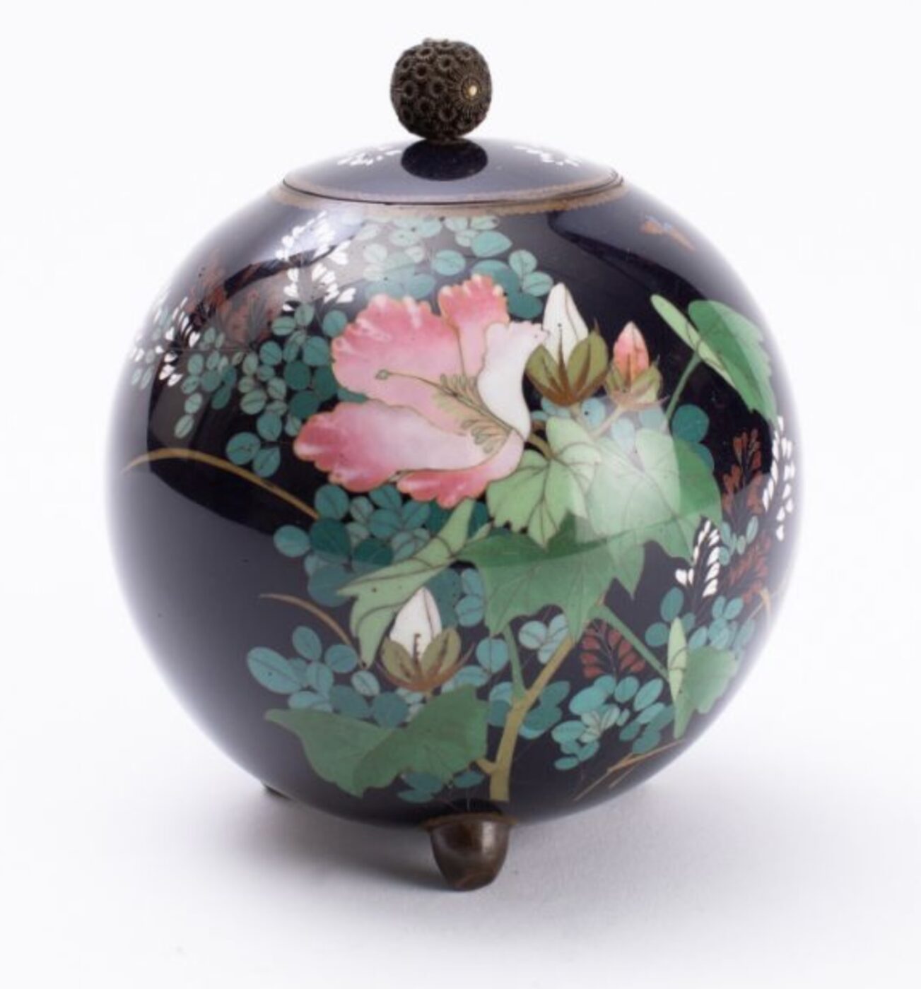 A beautiful and highly decorated colour is only jar and cover with floral and butterfly decoration. Diameter 14 cms