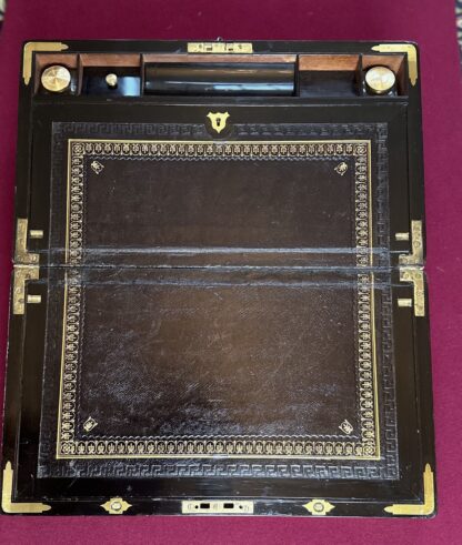 19th century, Coromandel, correspondence box of exceptional quality. The hinged lid opening to a tooled leather writing slope which opens to a well with a hidden spring, concealing three secret drawers. This is an outstanding piece and would have been made for a high-ranking officer or colonial administrator. Ht 18, W 46, D 26