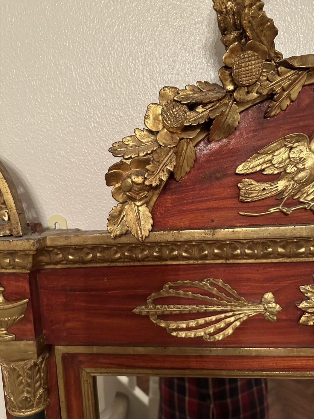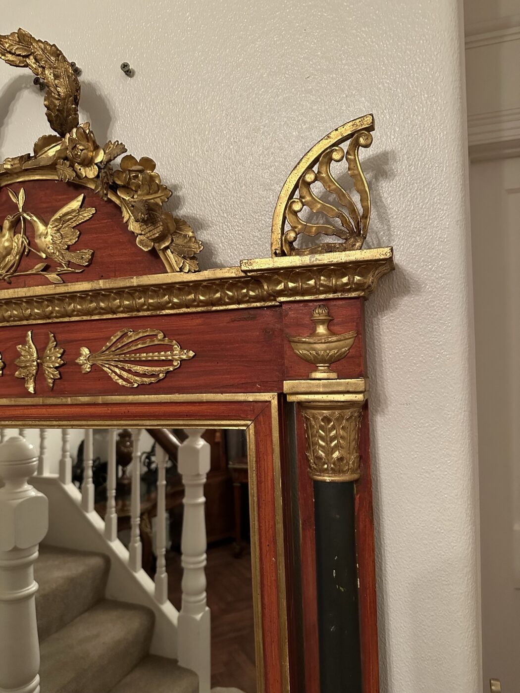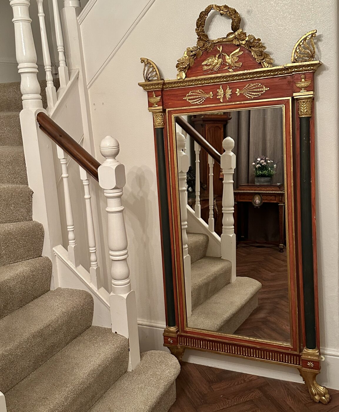 Most decorative Empire mirror circa 1890. The pediment with fruiting leaf decoration, enclosing twin birds over further decoration, flanked by pillars, terminating on gilt lions paw feet. This mirror, with a very unusual design would enhance the decor of a fine home. Ht 195, W 92, D 8.5 cms.