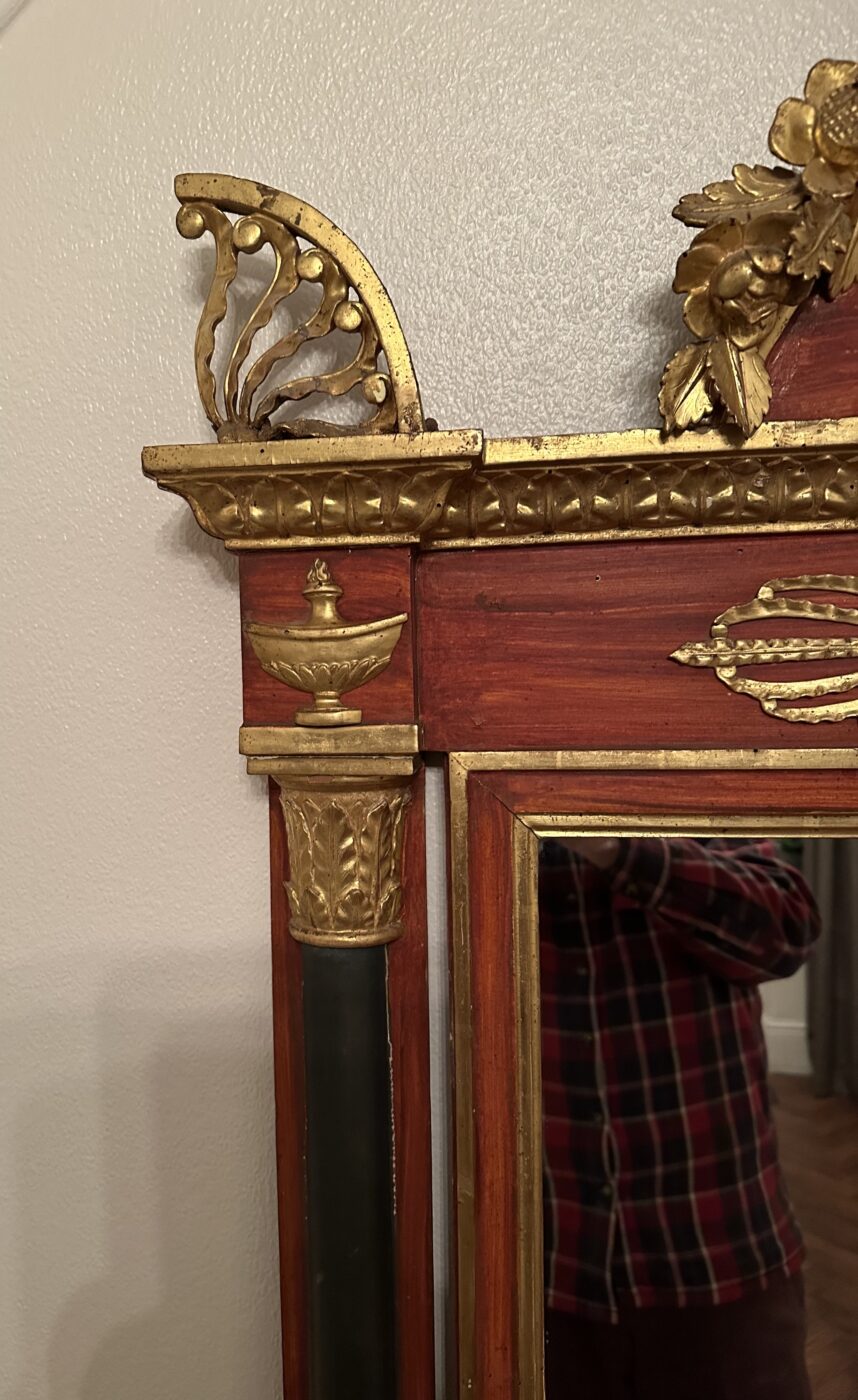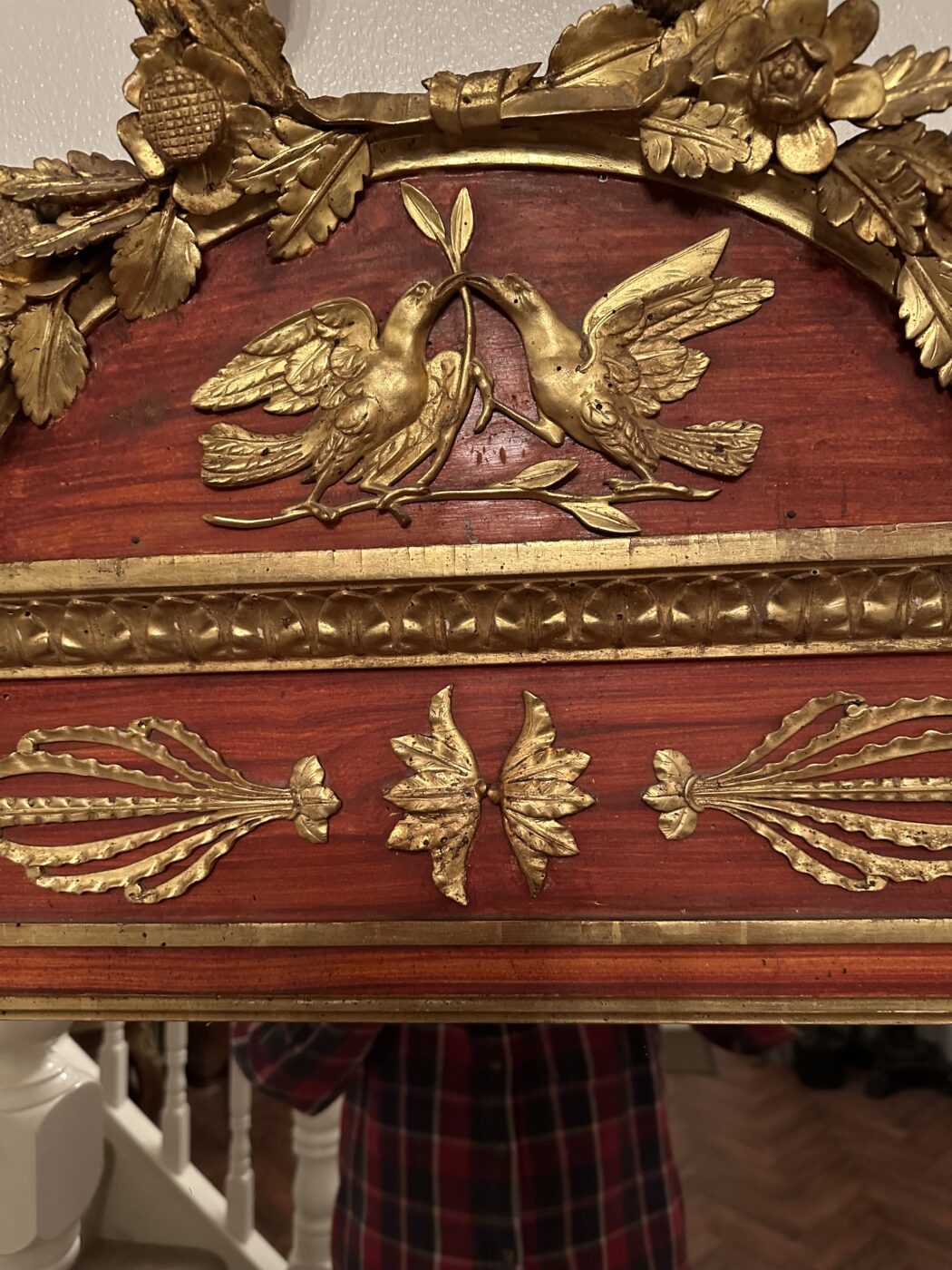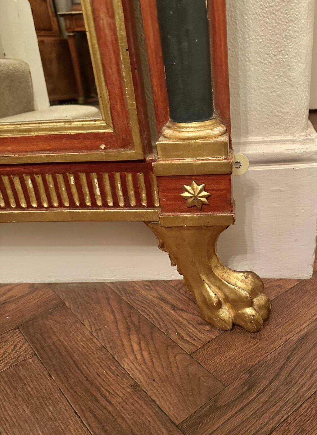 Most decorative Empire mirror circa 1890. The pediment with fruiting leaf decoration, enclosing twin birds over further decoration, flanked by pillars, terminating on gilt lions paw feet. This mirror, with a very unusual design would enhance the decor of a fine home. Ht 195, W 92, D 8.5 cms.