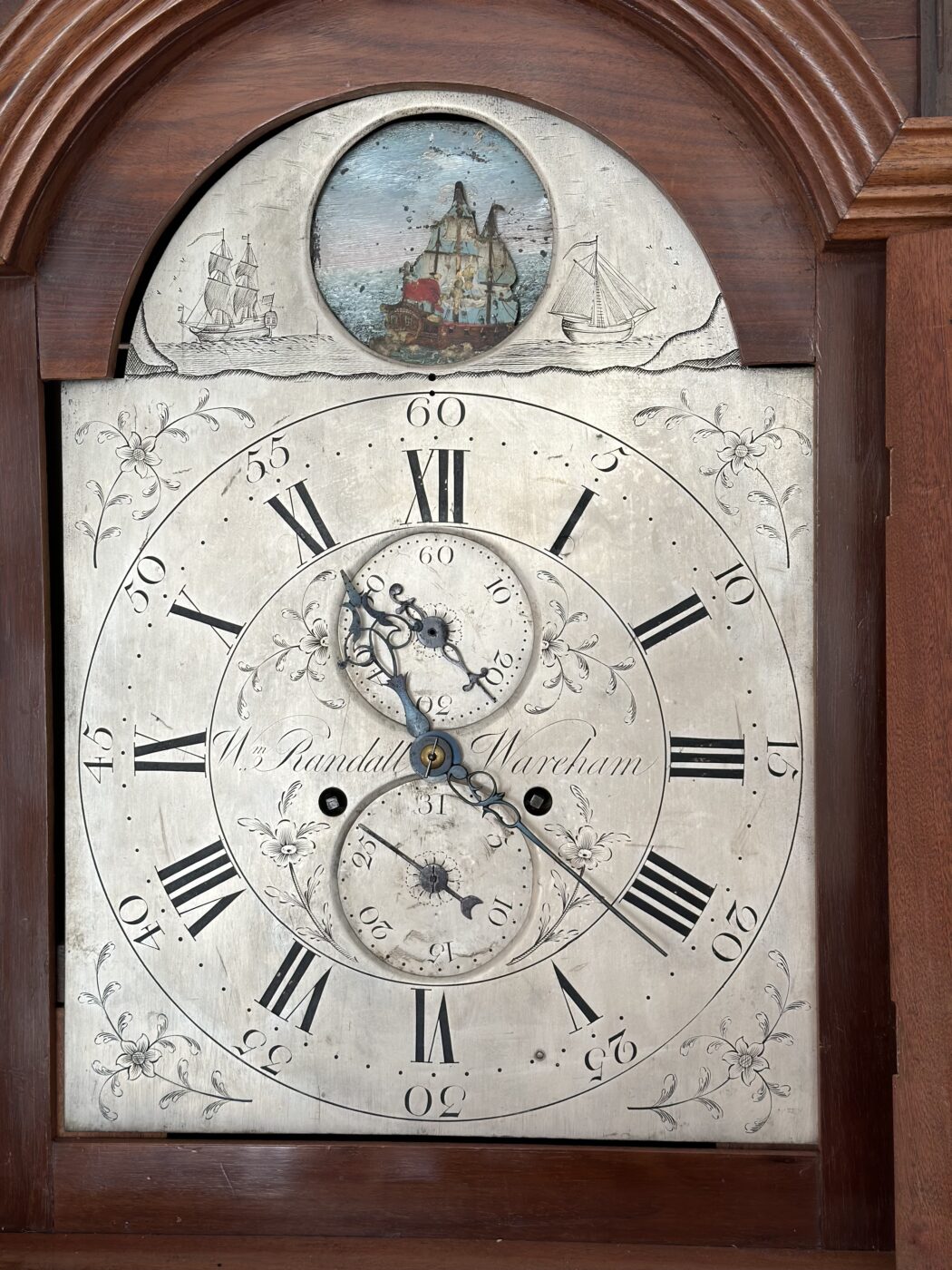 The arched silvered dial with an aperture, revealing a rocking ship activated by the beat of the pendulum with subsidiary dials for seconds and the day of the month, inscribed, Wm Randall Wareham. Ht 228, W 51, D 26 cms