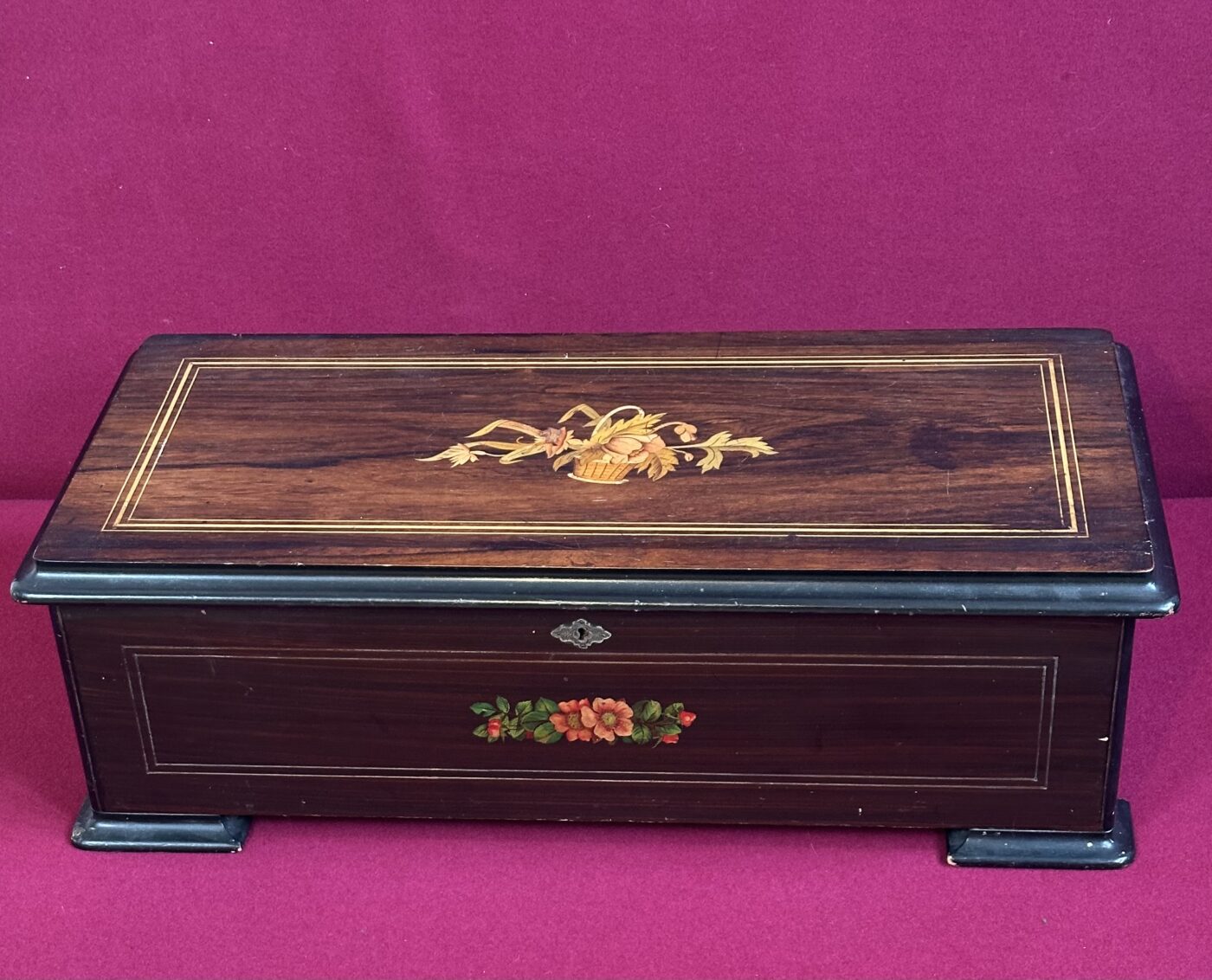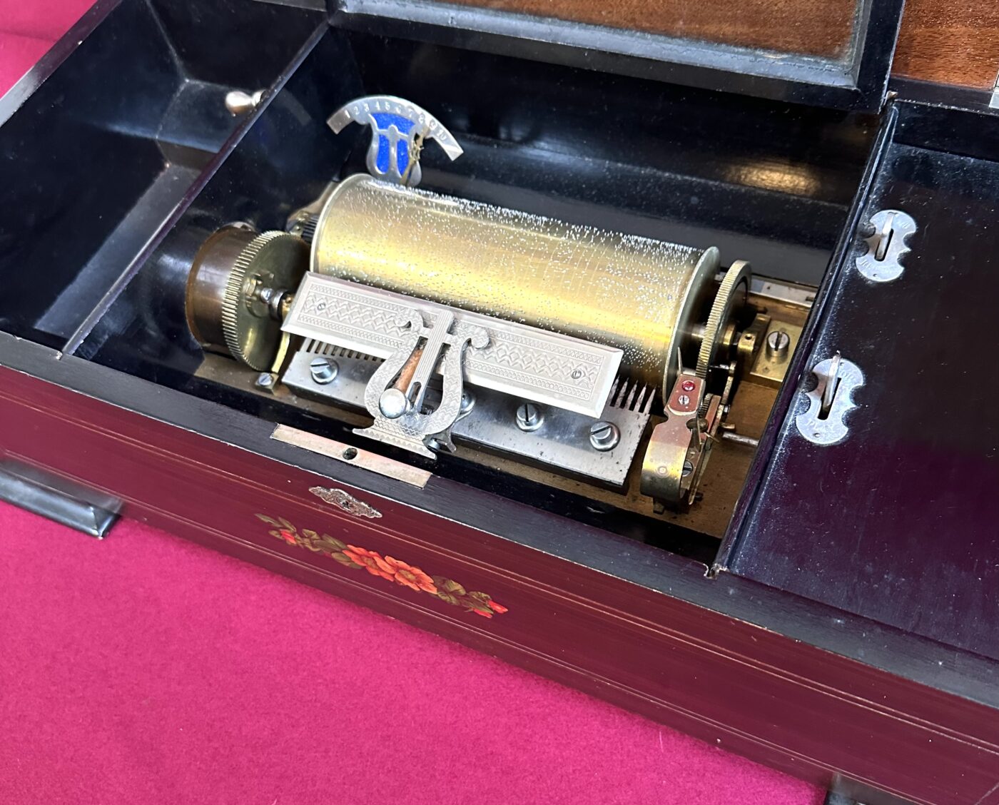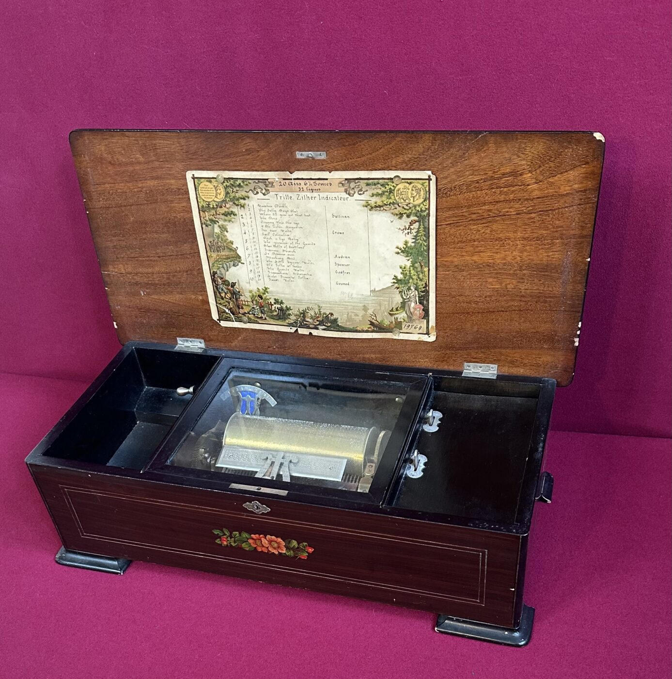 A good Victorian Music Box with two per turn cylinder, playing 20 popular Victorian aires. As can be seen in the illustration this has a very unusual fat cylinder. This box plays with a very clear sound and resonance. Ht 19, W 60, D 20 cms