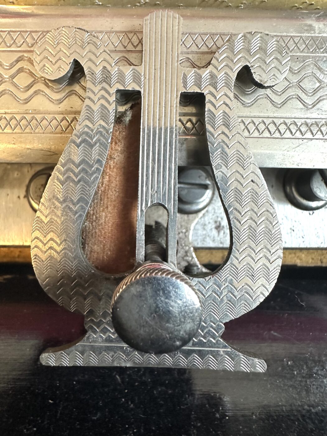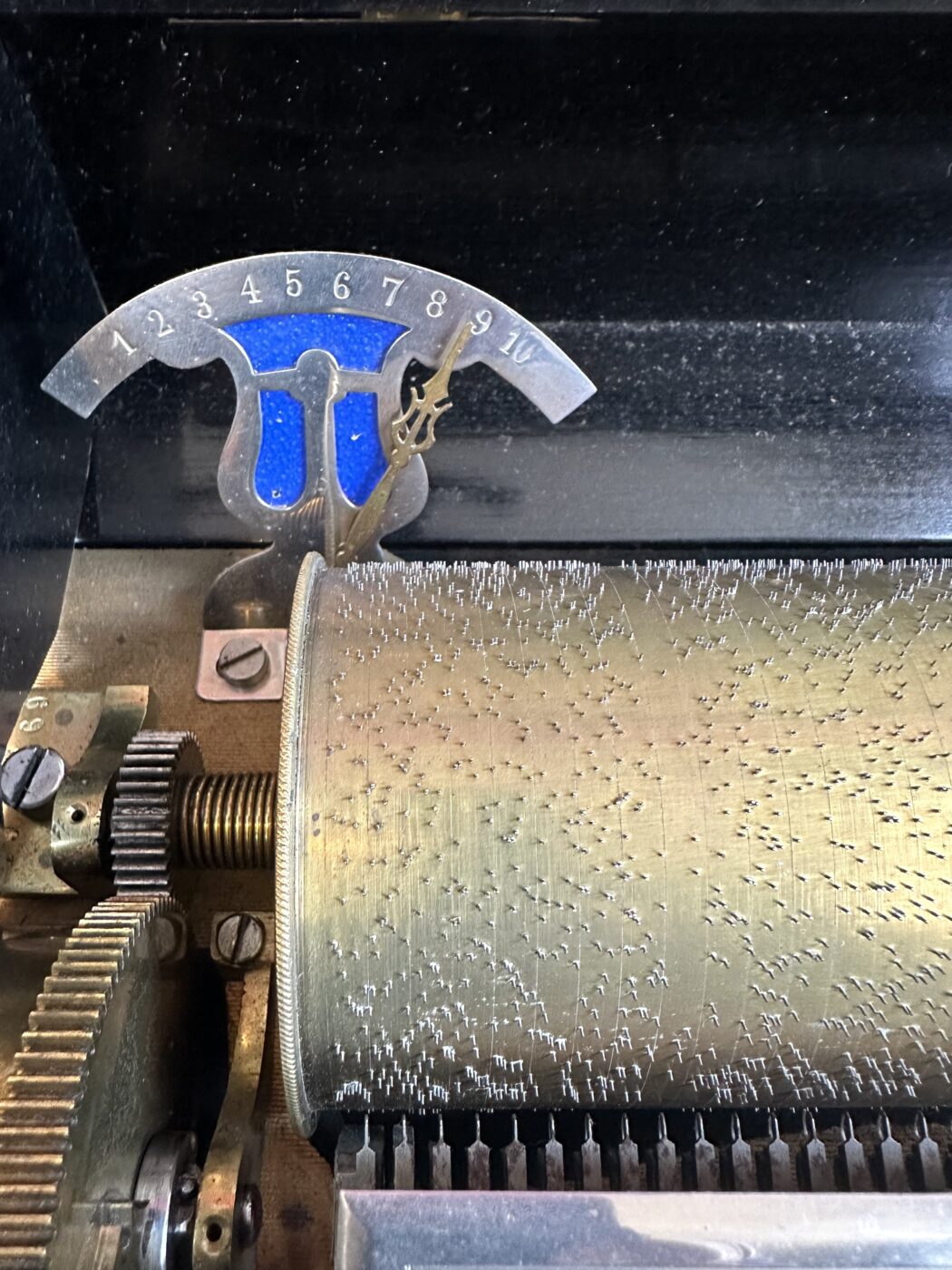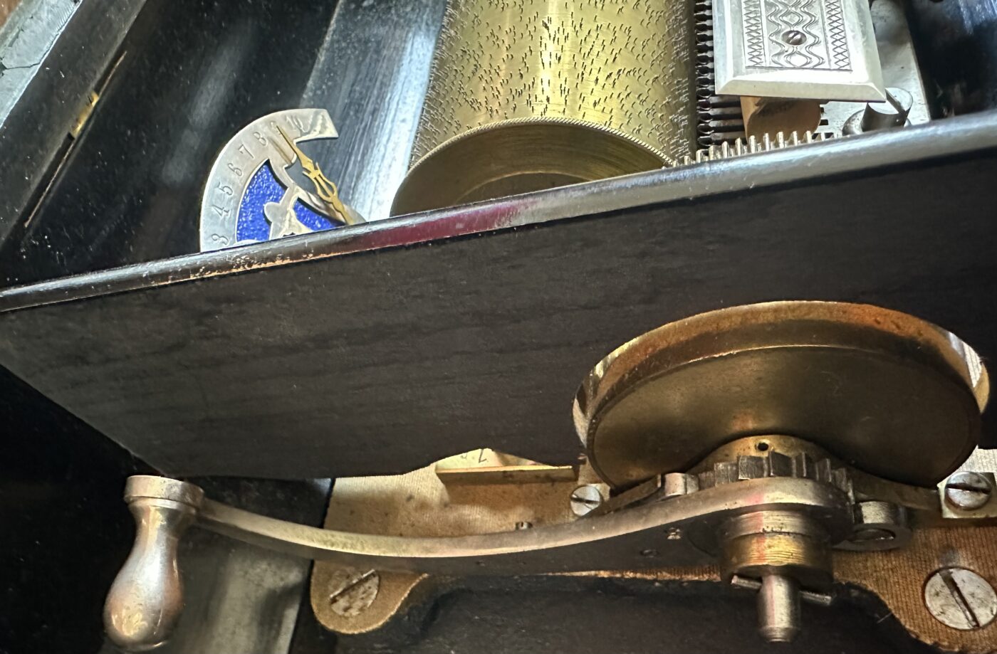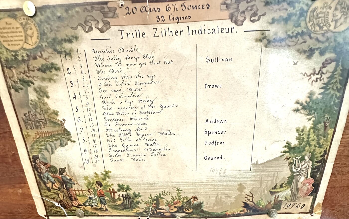 A good Victorian Music Box with two per turn cylinder, playing 20 popular Victorian aires. As can be seen in the illustration this has a very unusual fat cylinder. This box plays with a very clear sound and resonance. Ht 19, W 60, D 20 cms