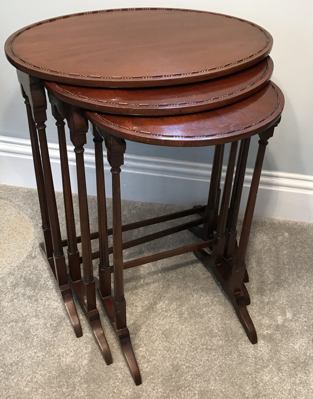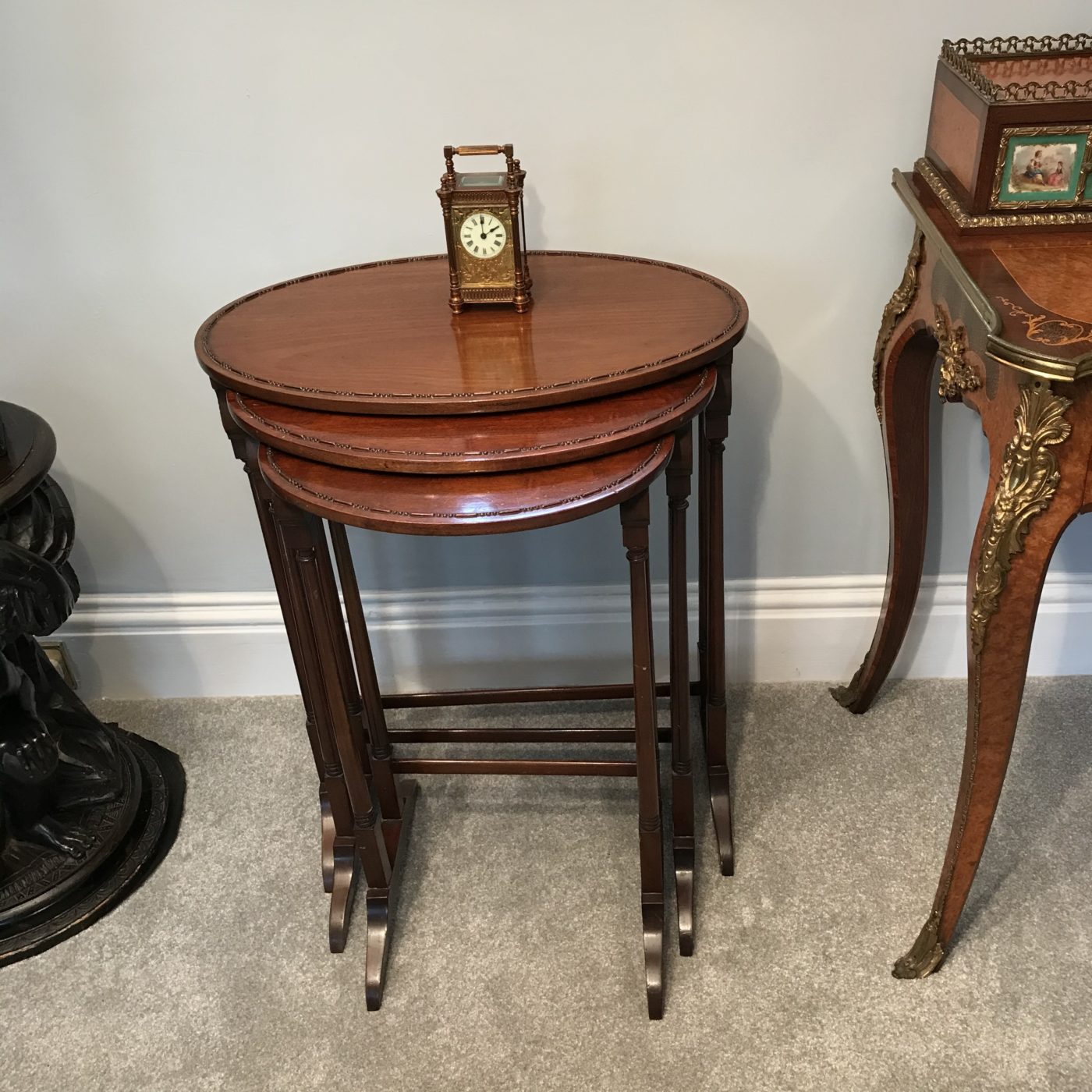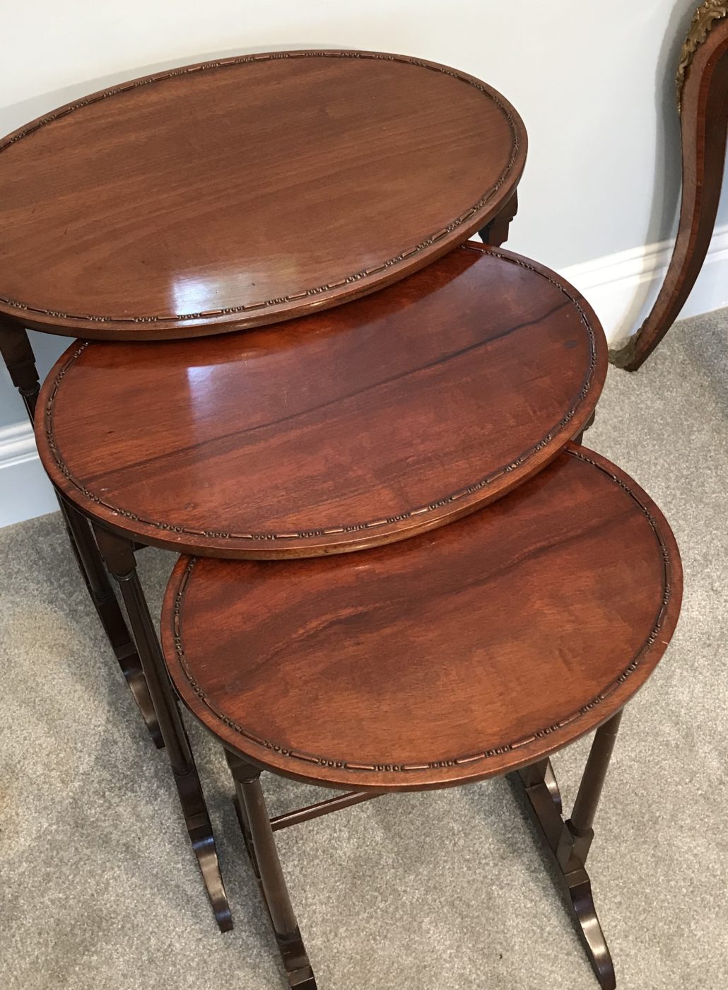 A most useful and decorative nest of. 3 tables. The oval tops of a good colour with beaded decoration on slender tone supports. Ht 66, Wd 56, D 38 cms.