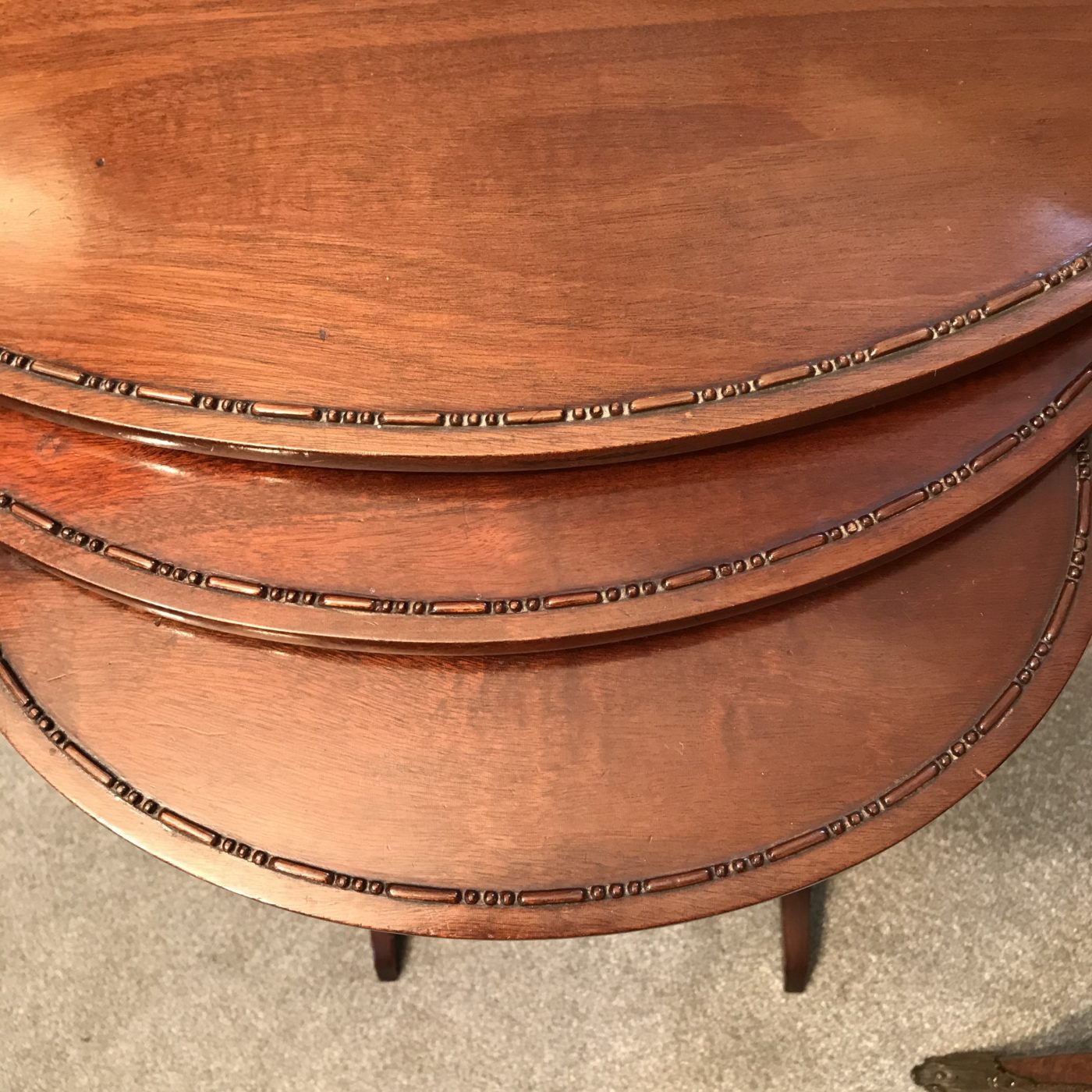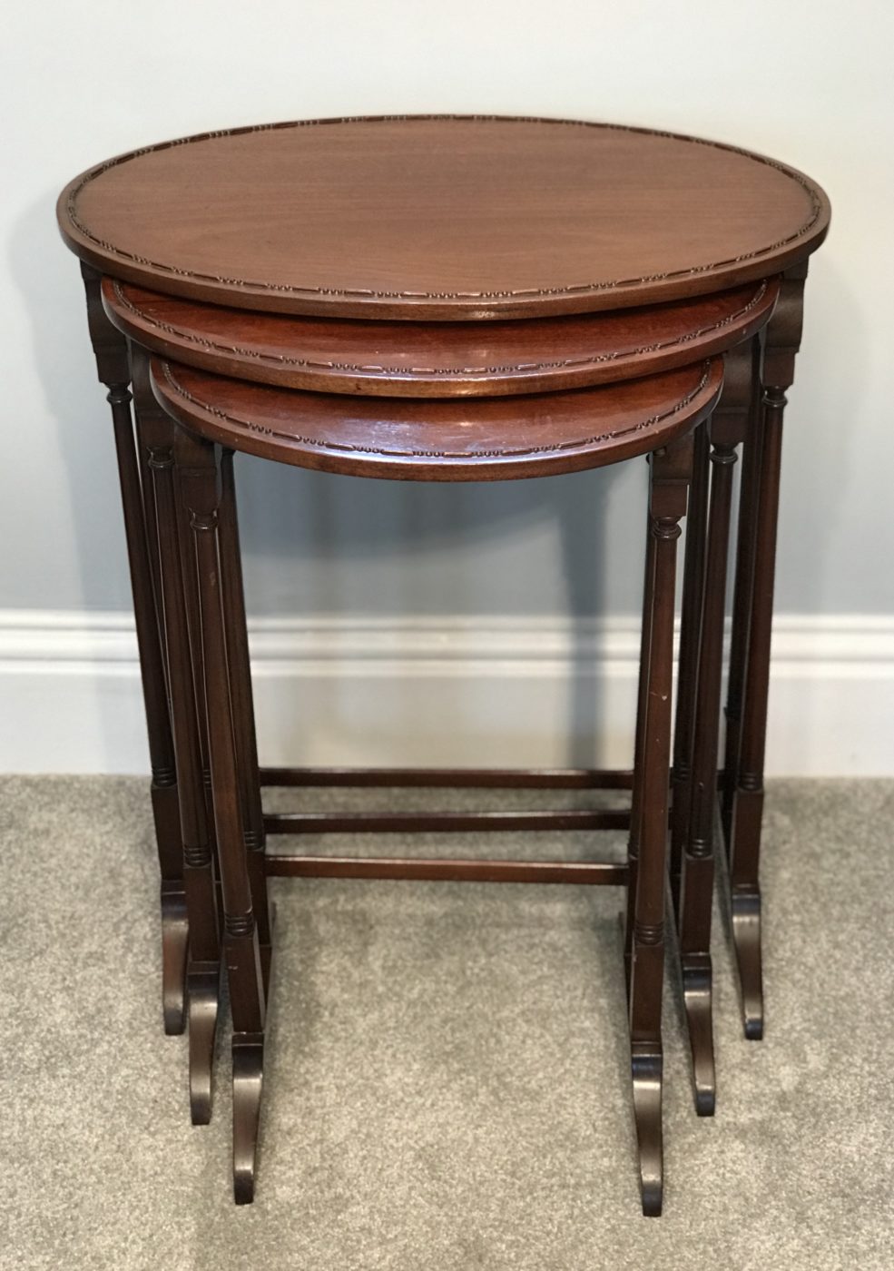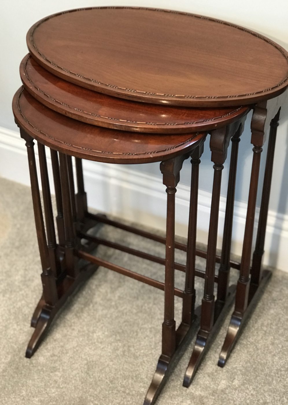 A most useful and decorative nest of. 3 tables. The oval tops of a good colour with beaded decoration on slender tone supports. Ht 66, Wd 56, D 38 cms.