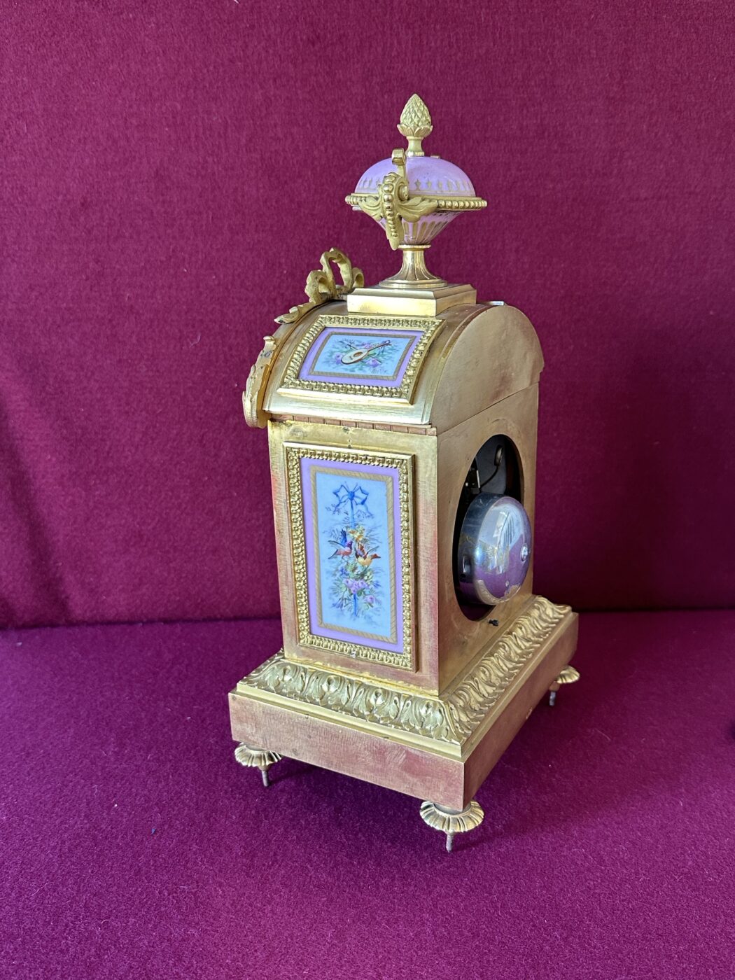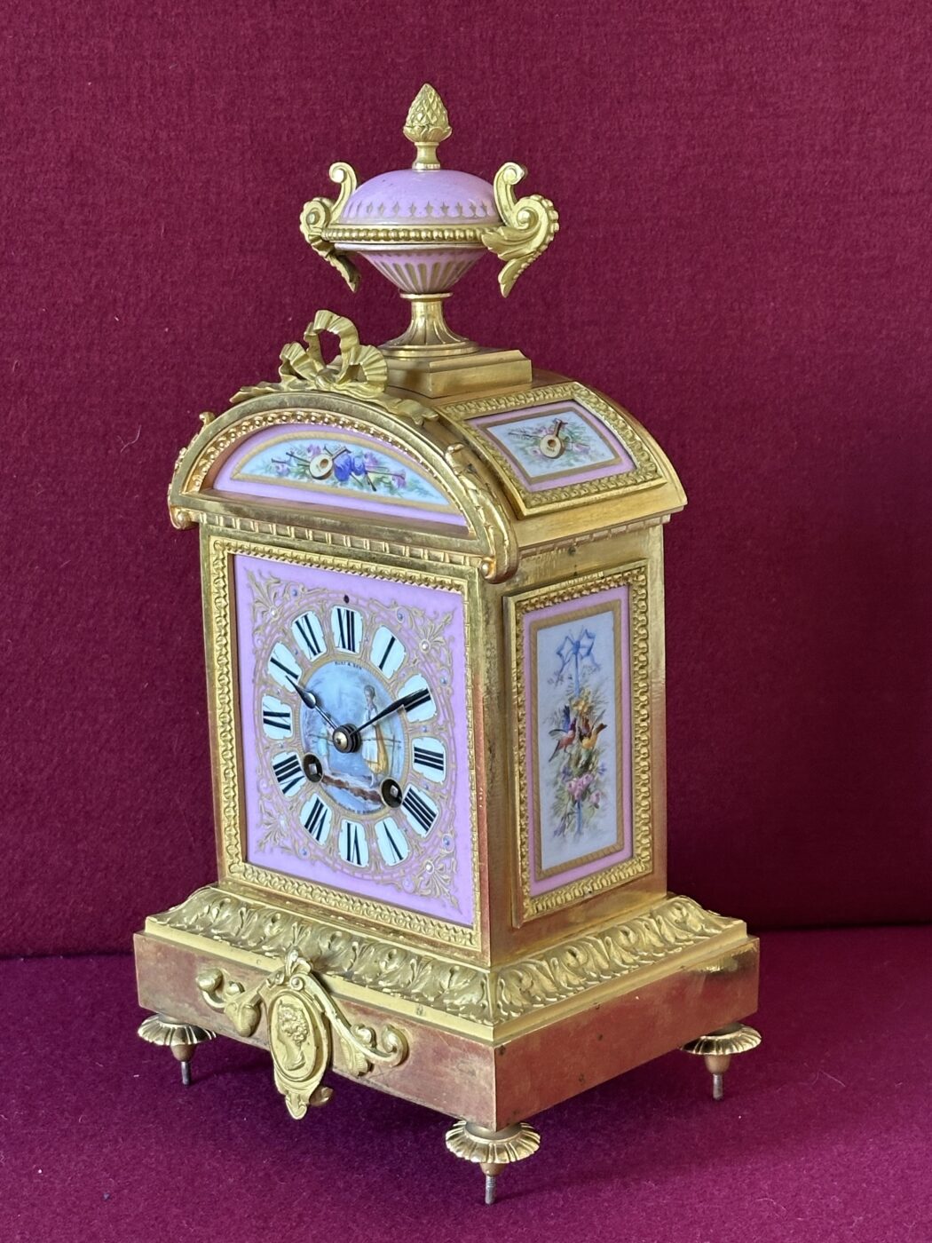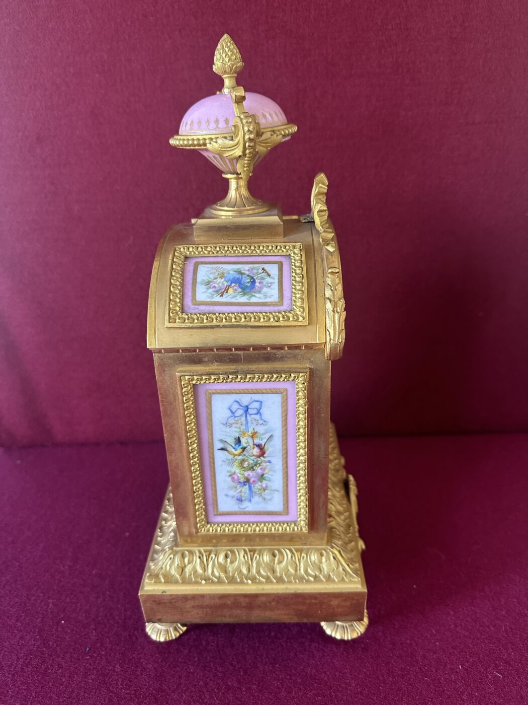A good quality French mantle, clock inset with beautifully detailed porcelain panels. The eight day movement striking the hours and half hours on a bell. Ht 31.5, W 18, D 13 cms