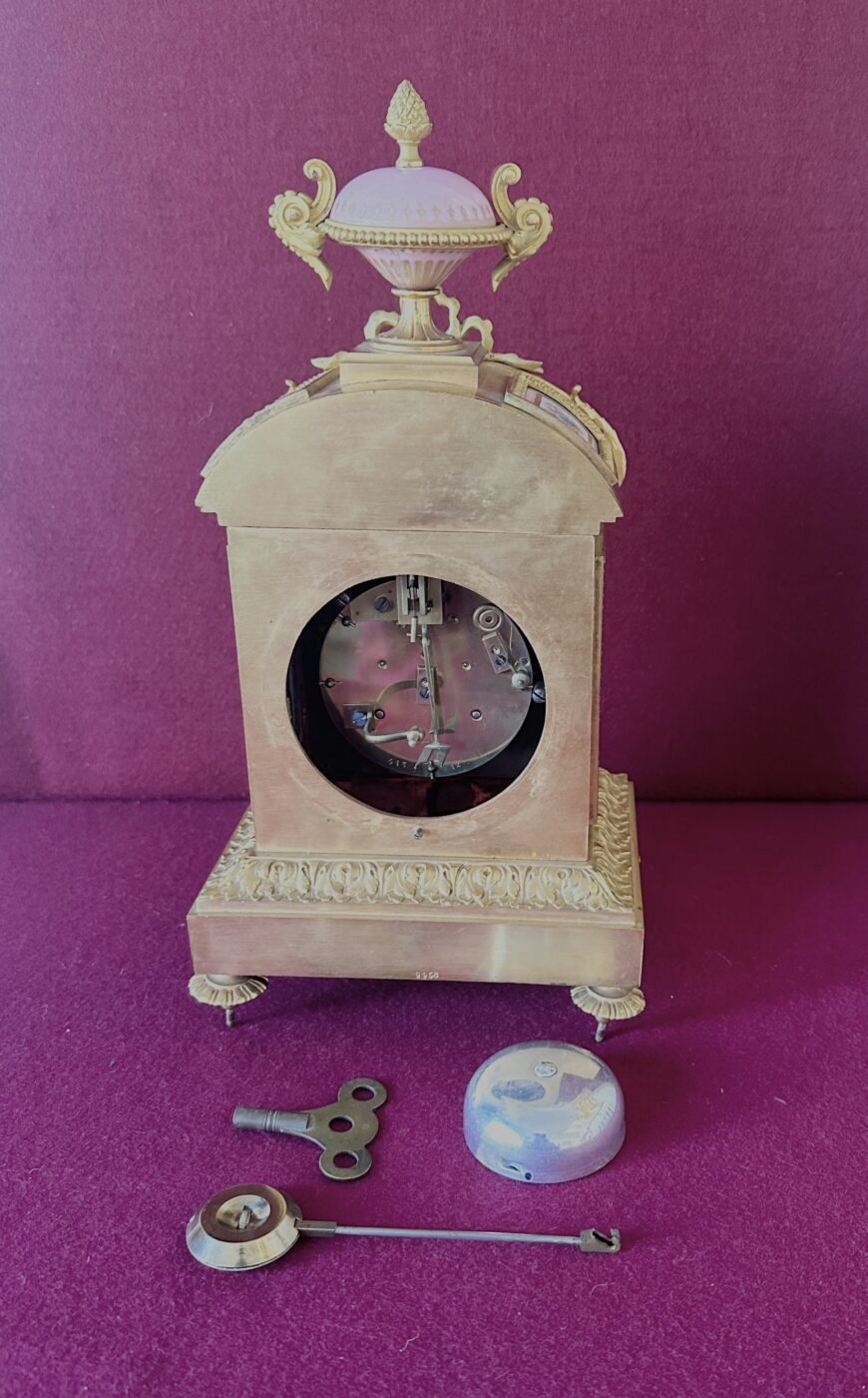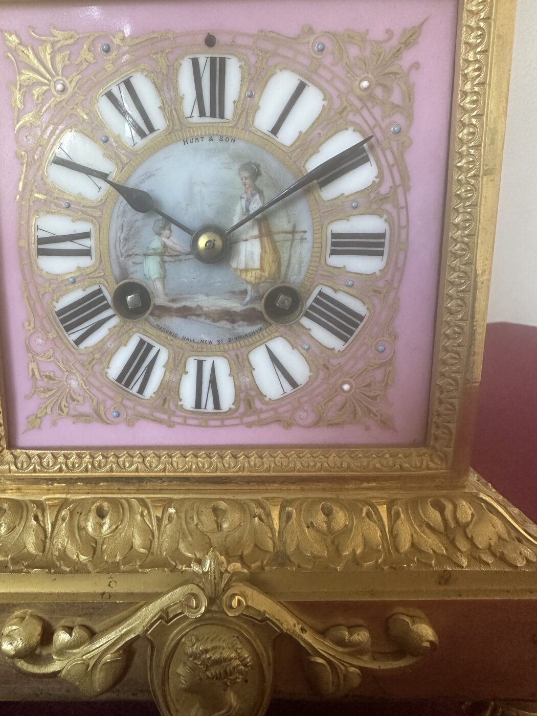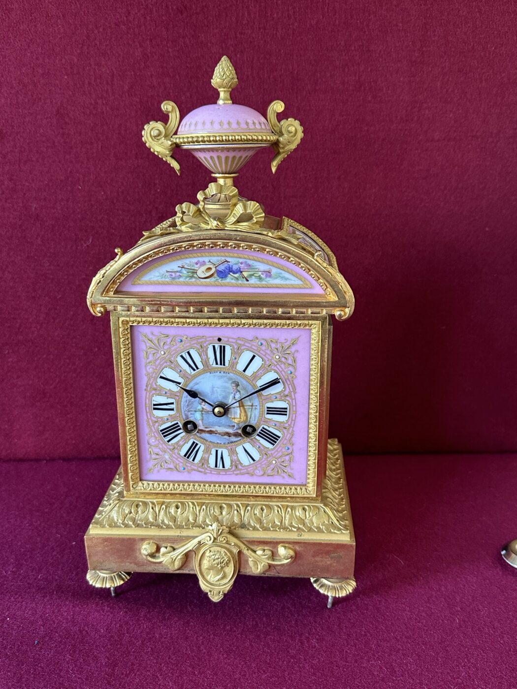 A good quality French mantle, clock inset with beautifully detailed porcelain panels. The eight day movement striking the hours and half hours on a bell. Ht 31.5, W 18, D 13 cms