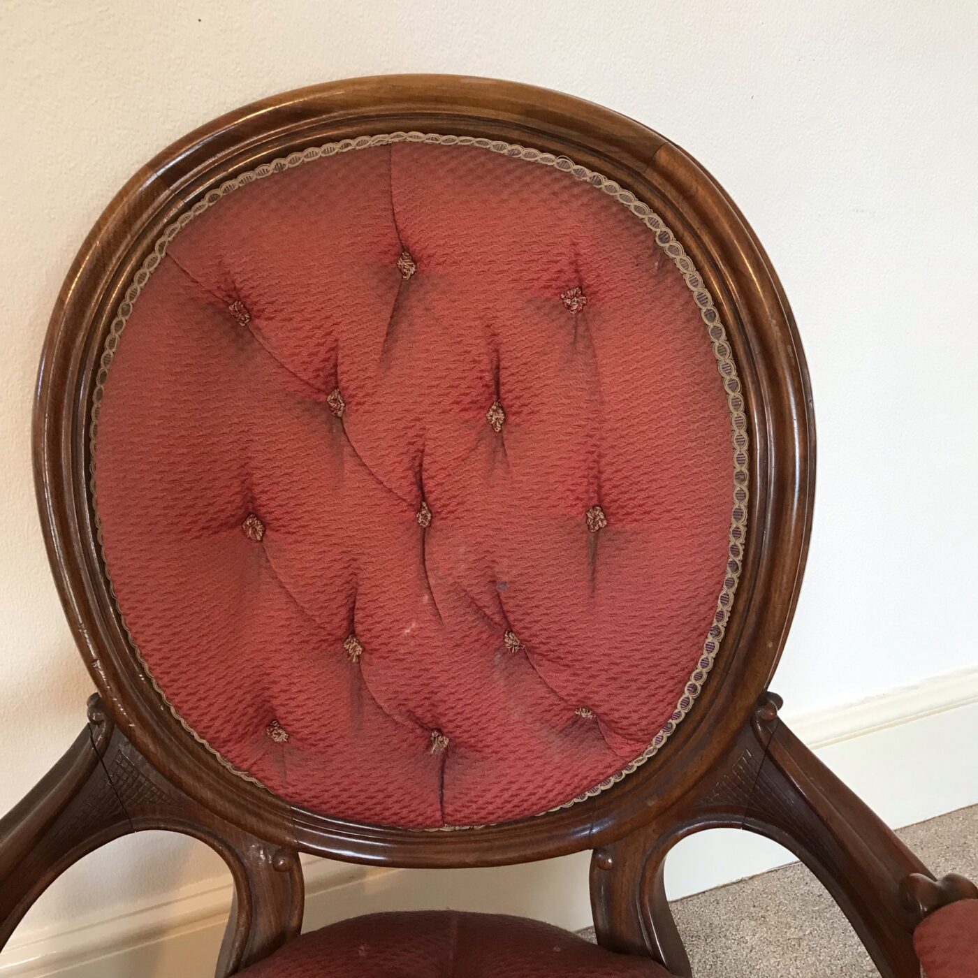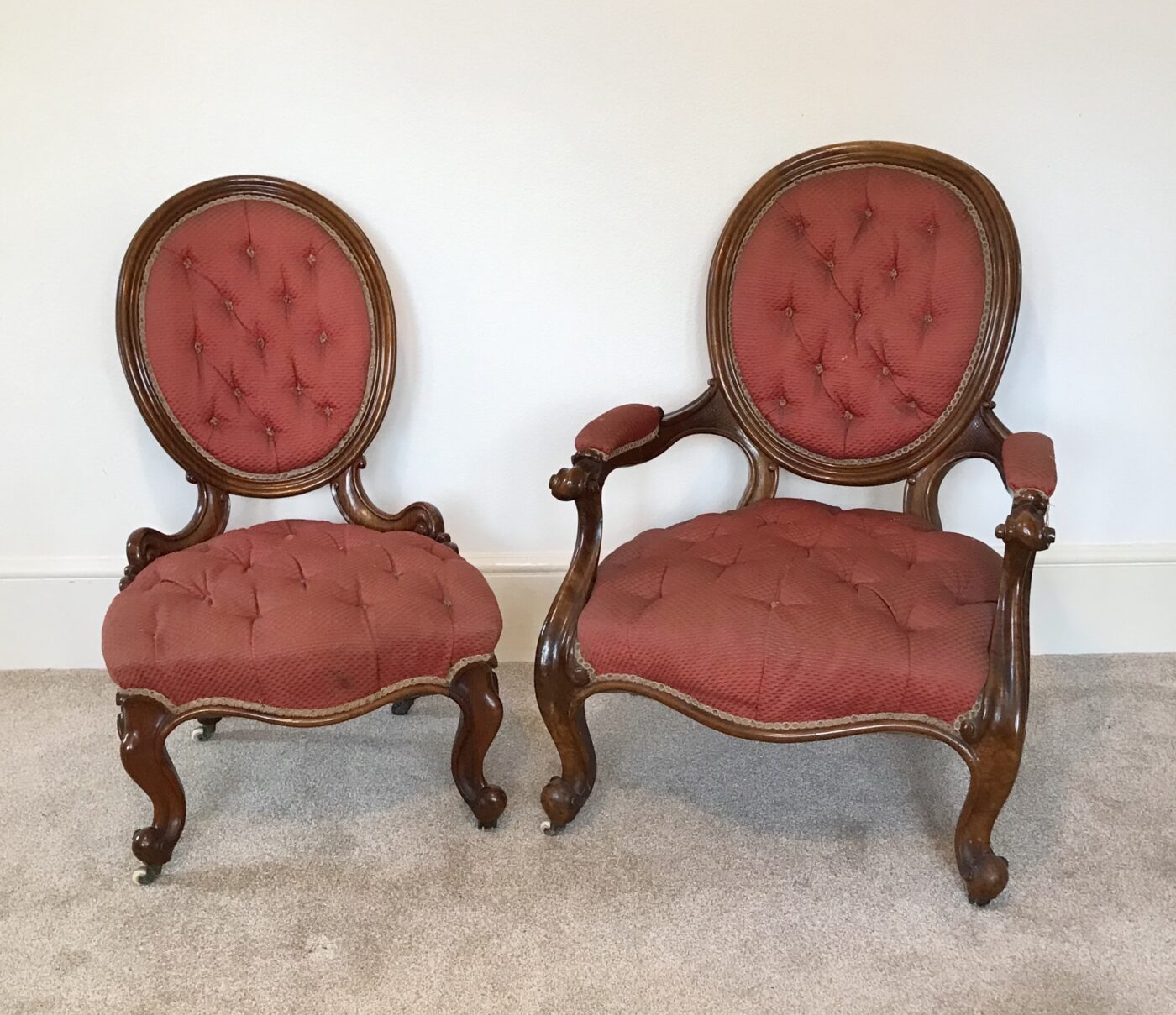 A good pair of Victorian button back salon chairs. The frames of these chairs are extremely sturdy with a good colour and patina.