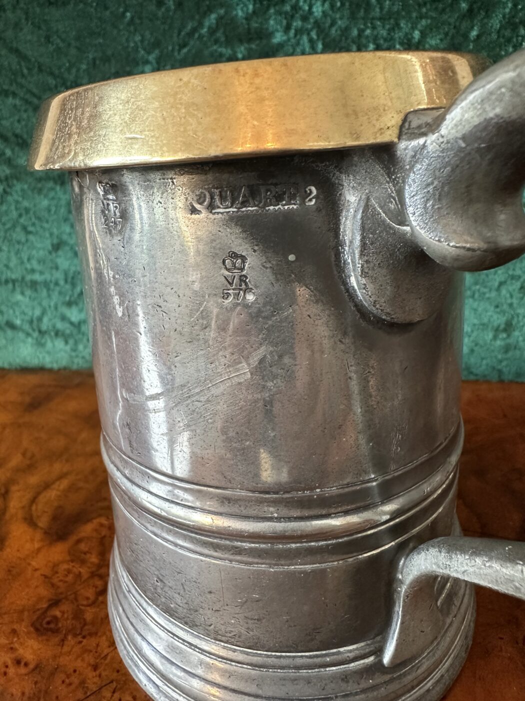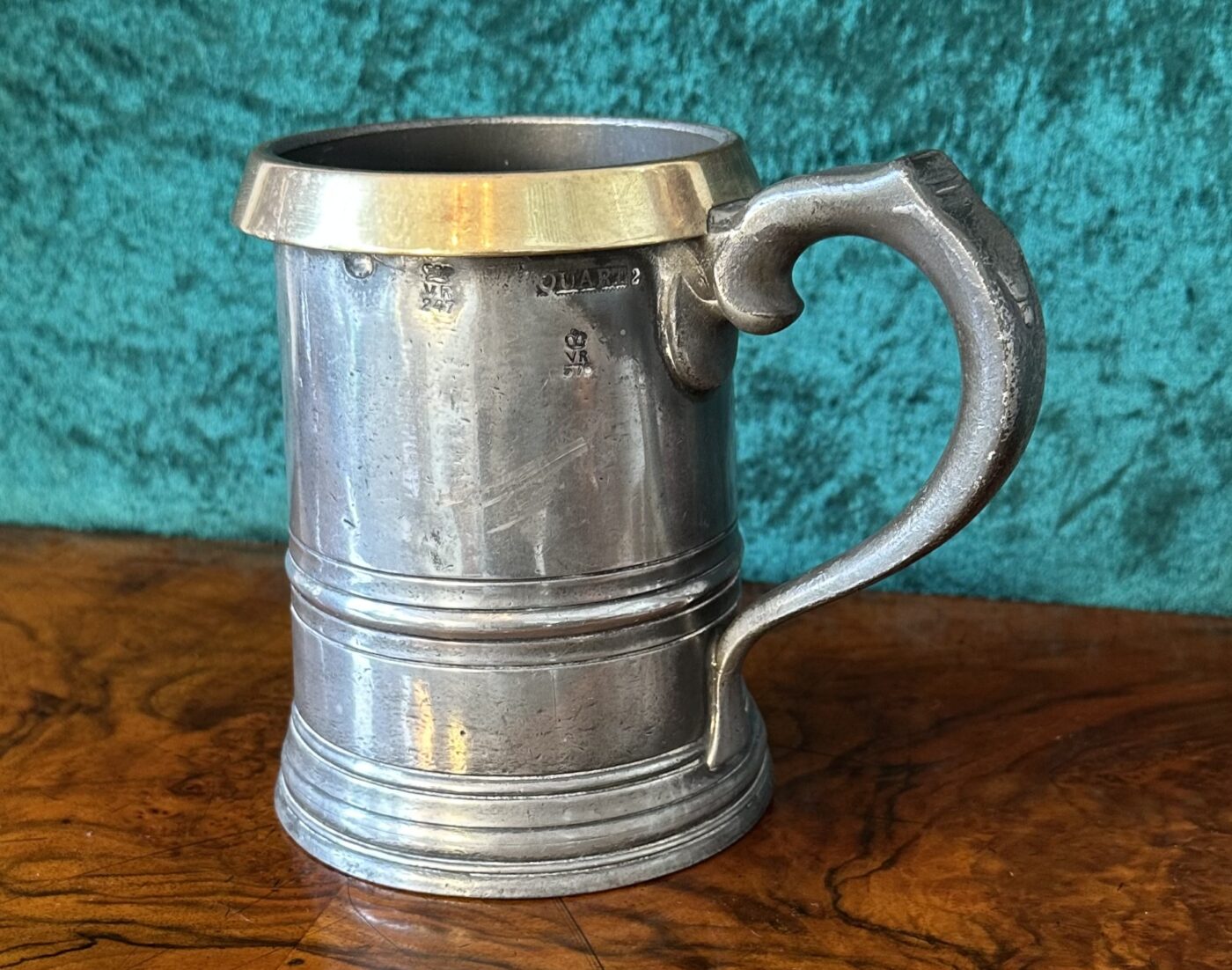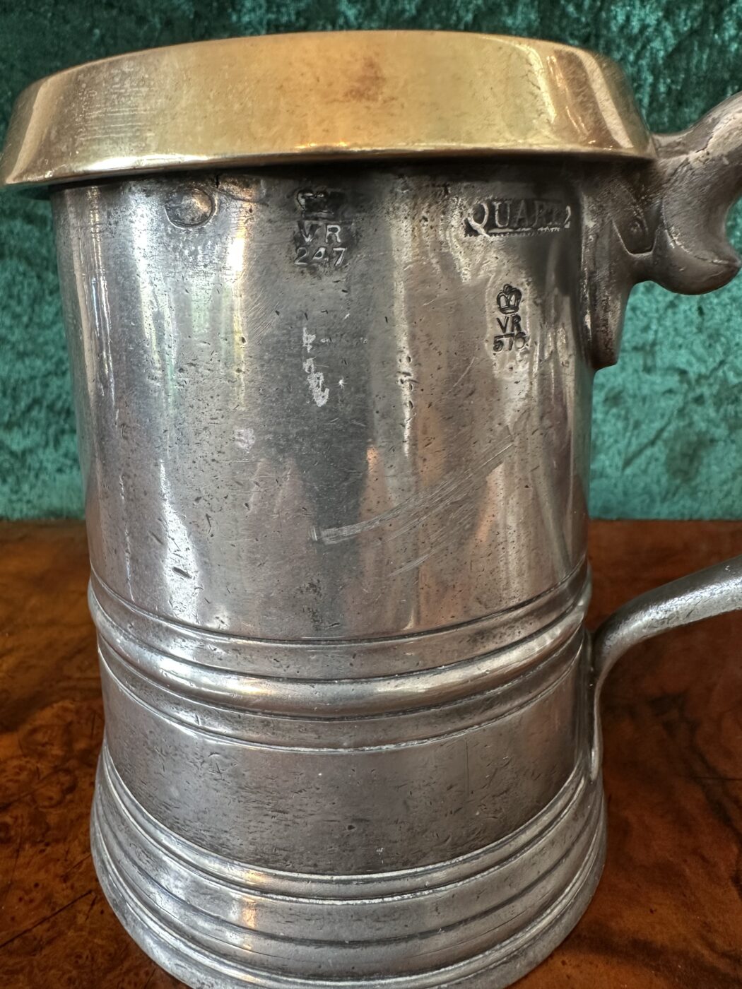 A most decorative tankard or volume measure with various stamps from the Victorian period. A very decorative item with no holes splits or cracks, a rare item having survived over 150 years.