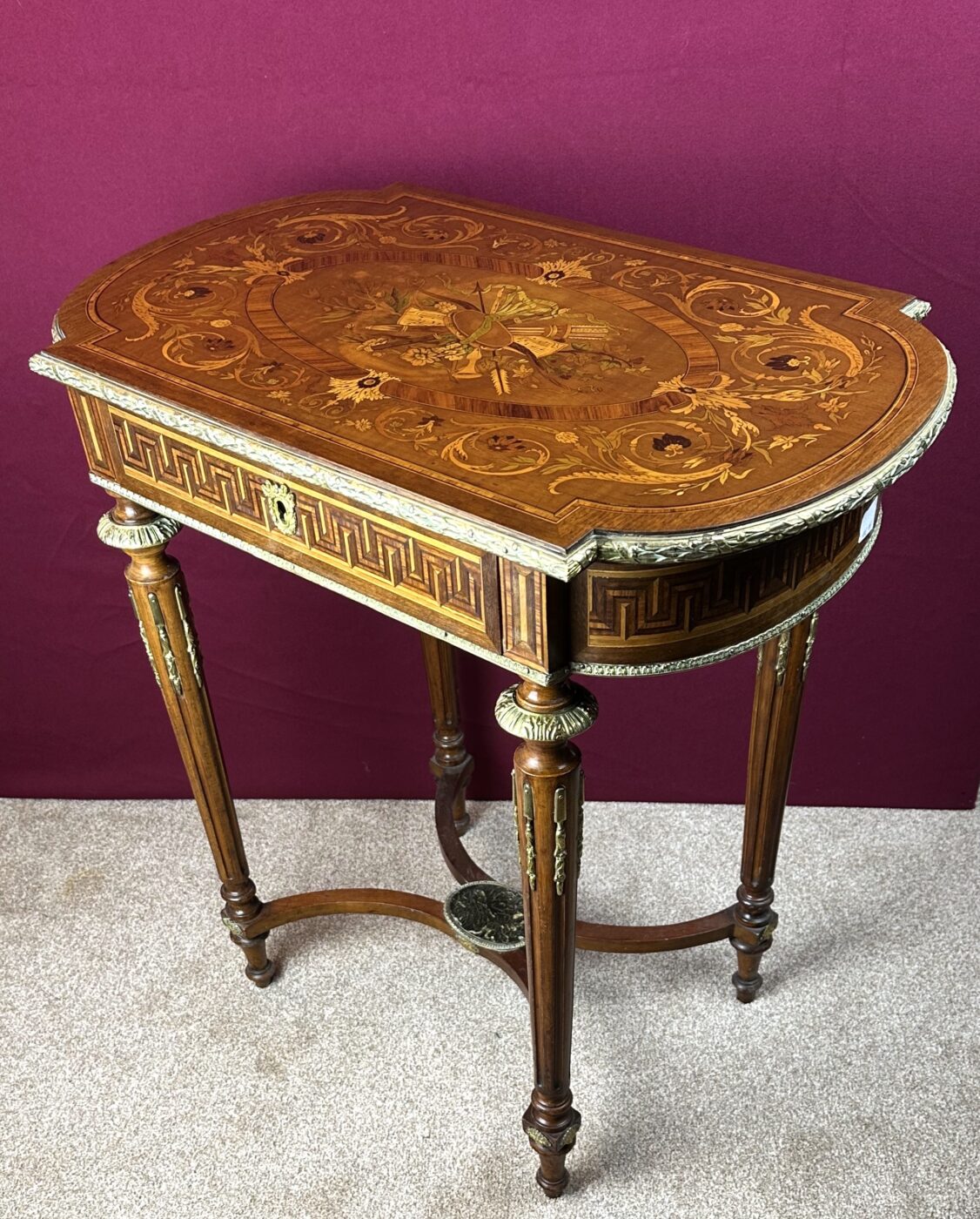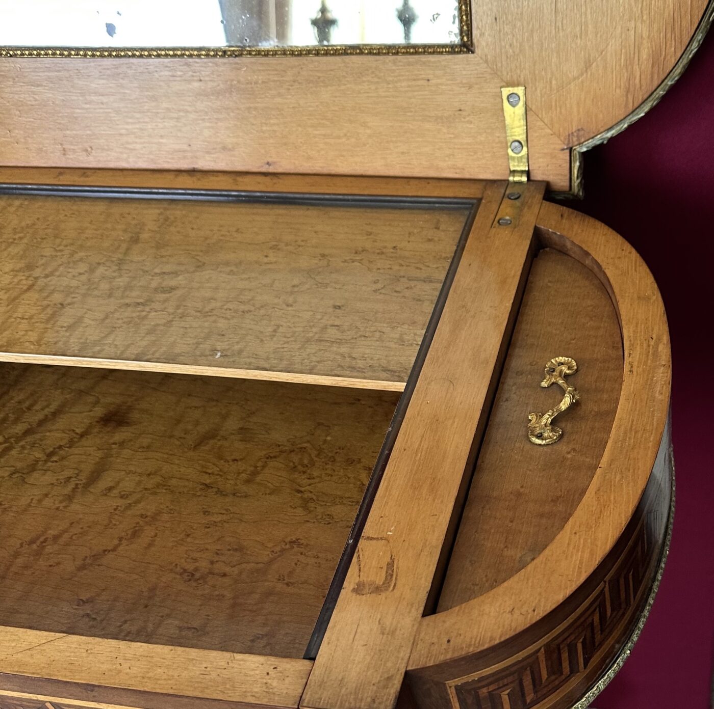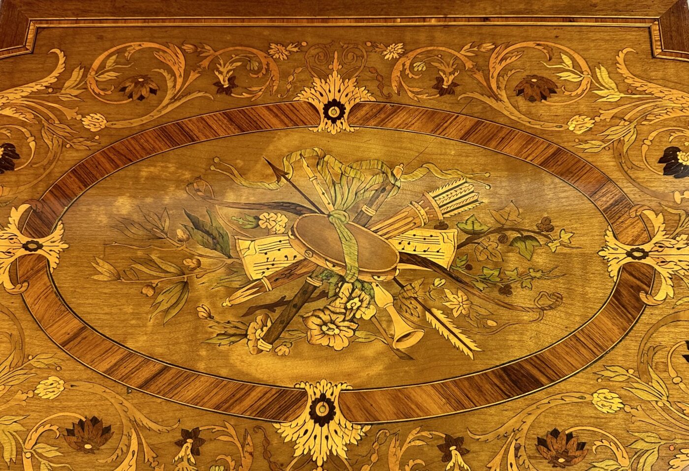 A superb quality poudreuse, the hinged lid finely inlaid with exceptional quality marquetry. The central oval with martial trophies and sheet music, opening to an interior with a mirror, a central well and two lidded compartments. The frieze fitted with a working lock and key, over tapered supports, joined by bowed stretchers. Ht 70, W 67.5, D 39 cms