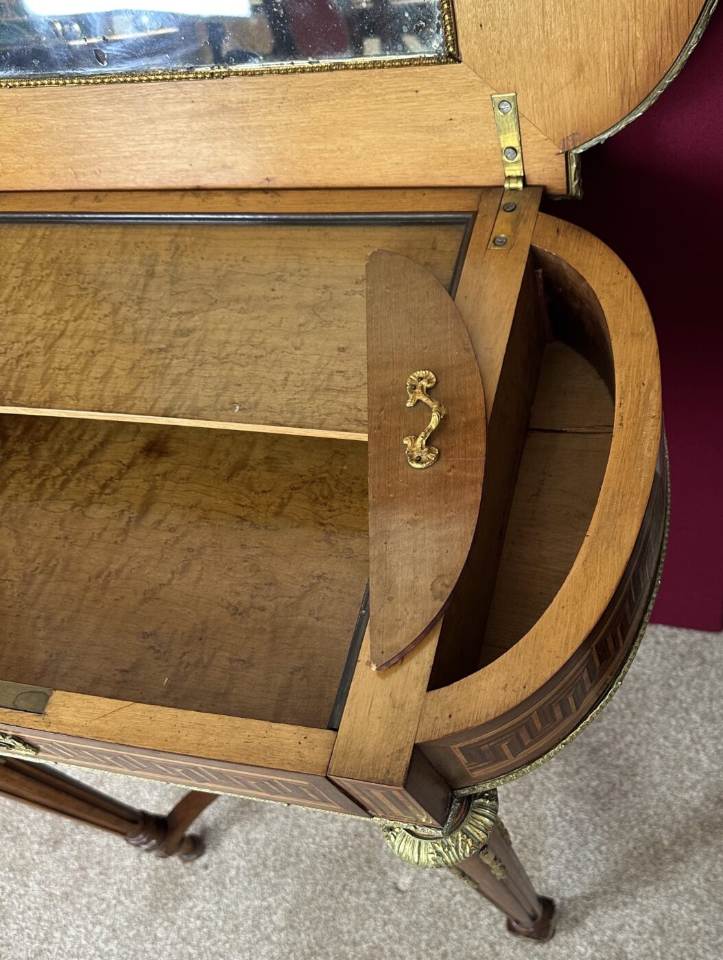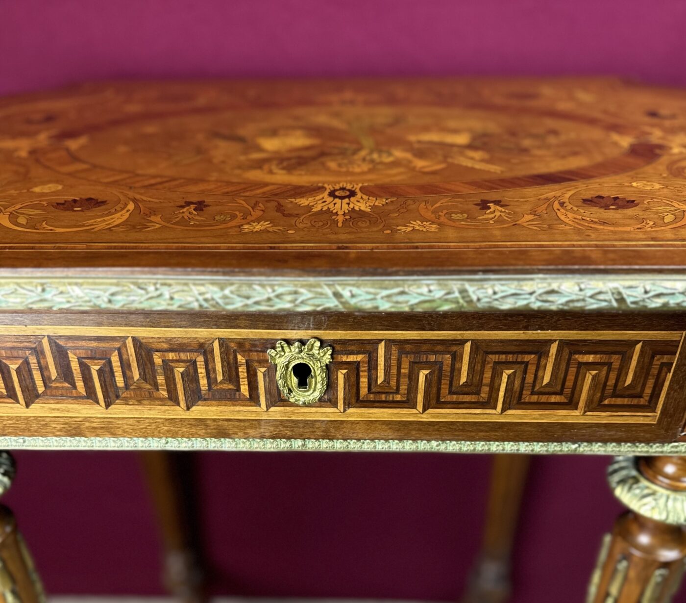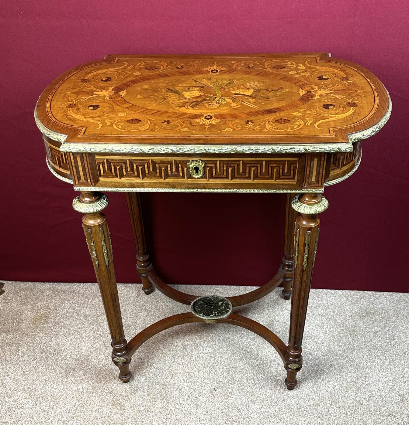 A superb quality poudreuse, the hinged lid finely inlaid with exceptional quality marquetry. The central oval with martial trophies and sheet music, opening to an interior with a mirror, a central well and two lidded compartments. The frieze fitted with a working lock and key, over tapered supports, joined by bowed stretchers. Ht 70, W 67.5, D 39 cms