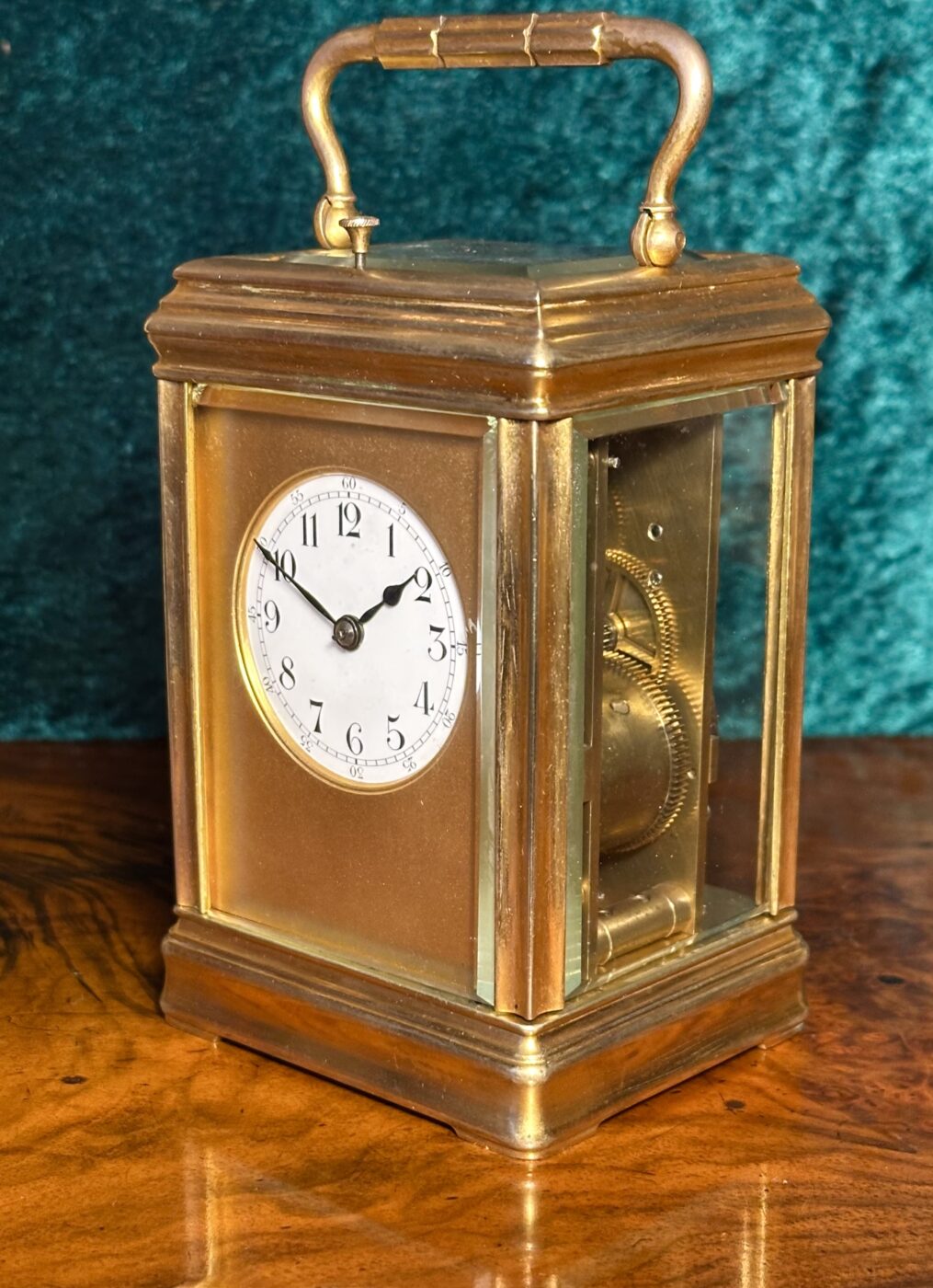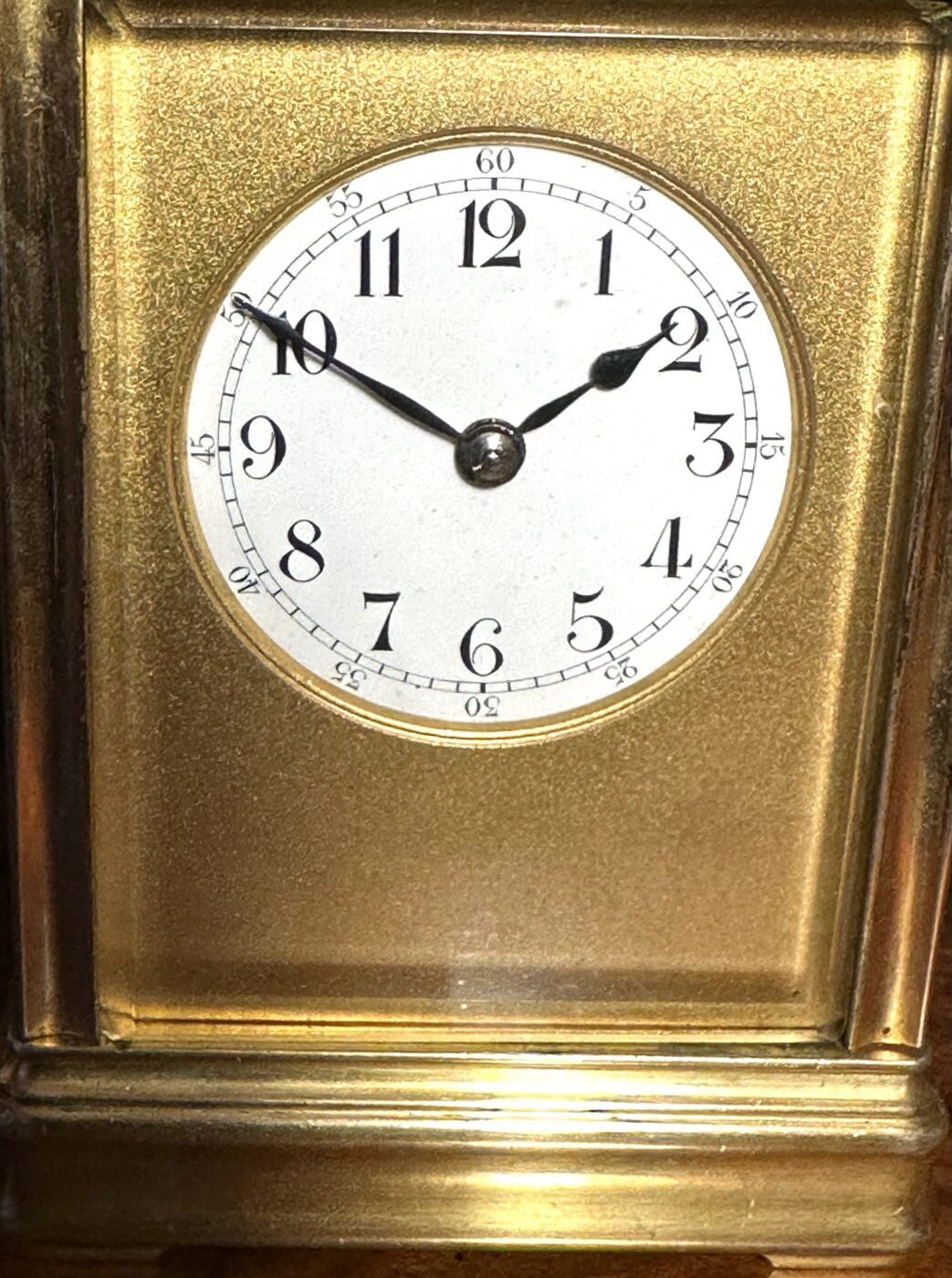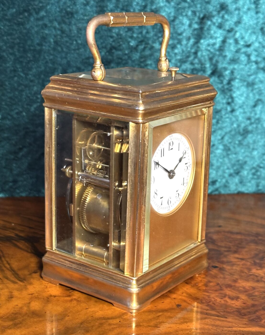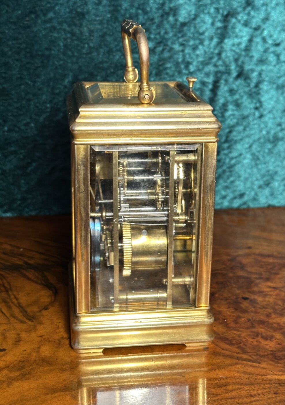 A very interesting carriage clock of small proportions. The movement of eight day duration striking the full hours and half hours on a blue steel gong. The clock keeps perfect time and has recently been serviced. This well-made clock comes complete with a repeat button striking the last hour. Ht 13, W 8, D 7.5 cms