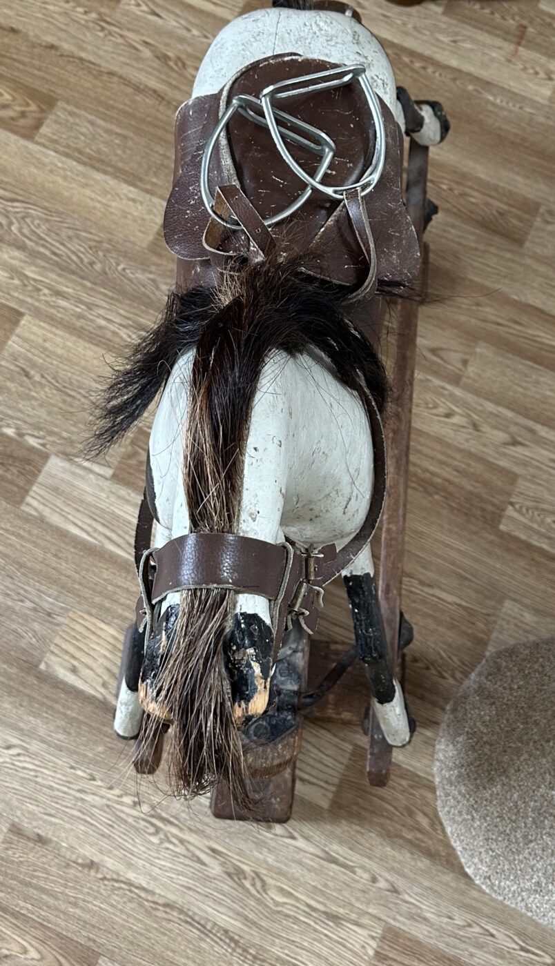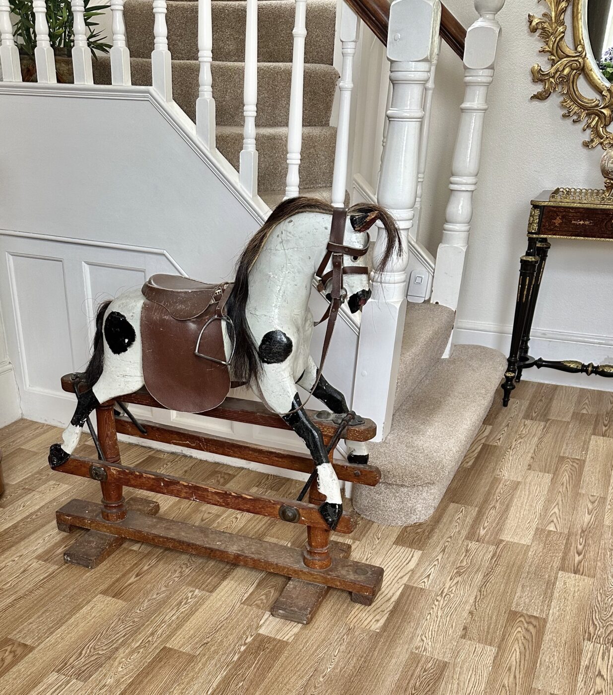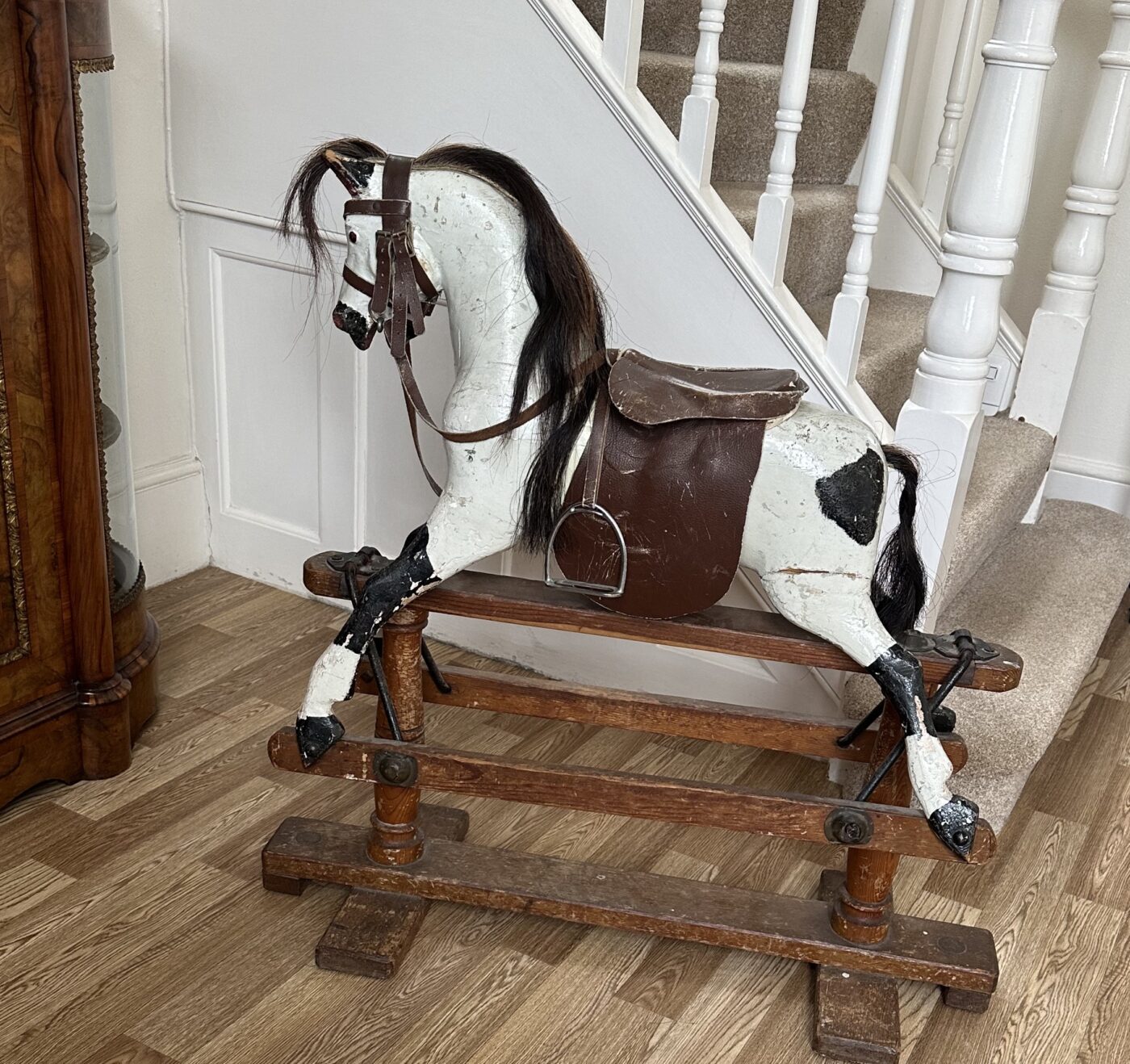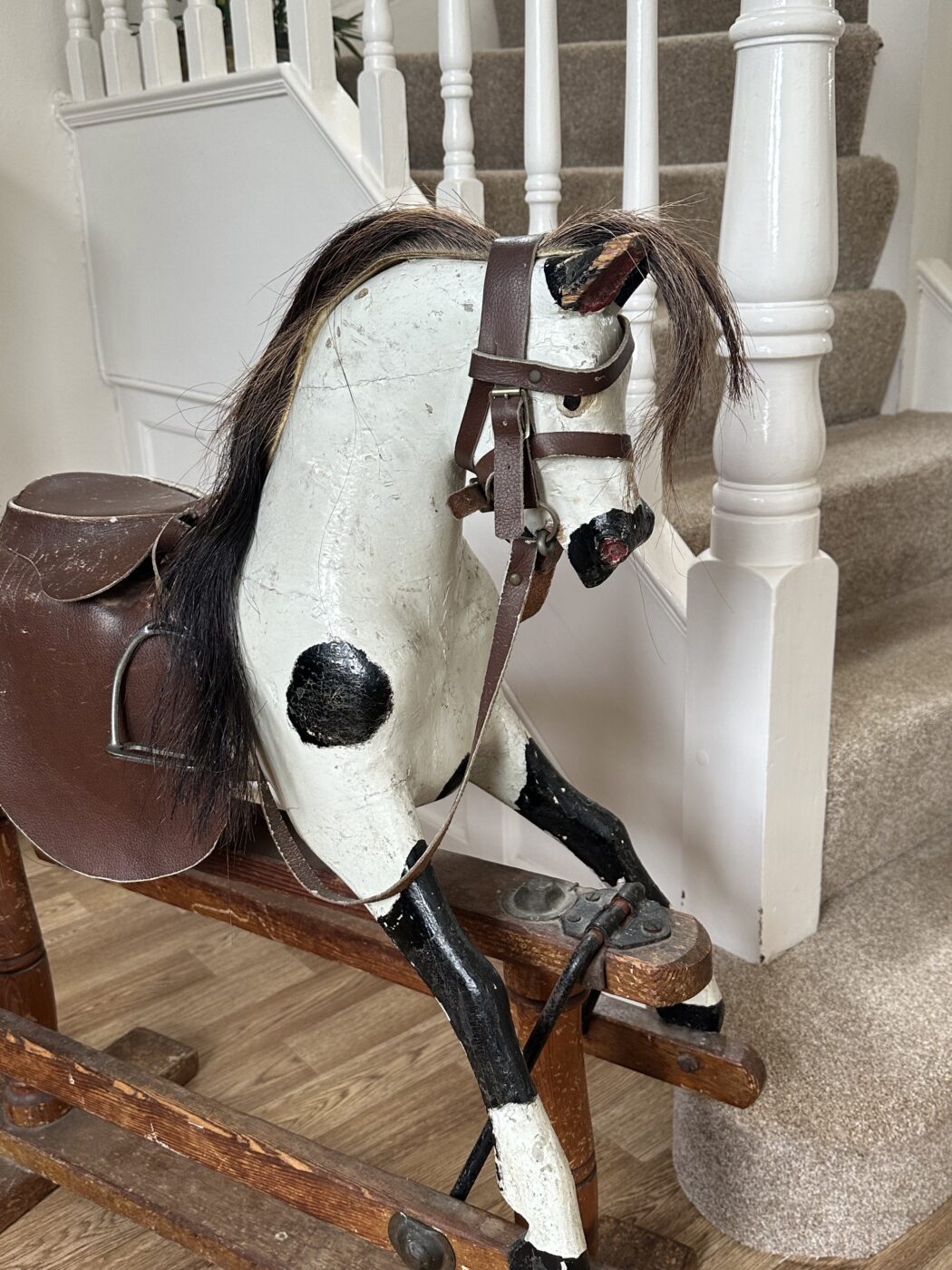 A truly original Victorian rocking horse. It has signs of much wear, reminiscent of many happy hours spent in the nursery, giving it a unique charm. Complete with saddle, stirrups and original horse hair mane and tail.