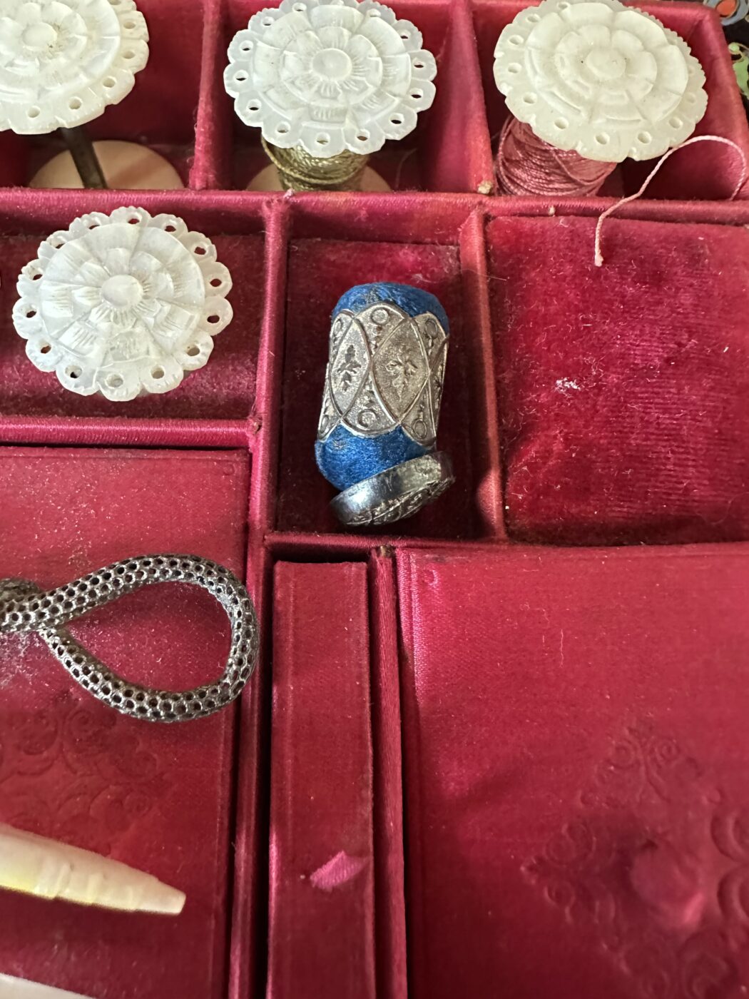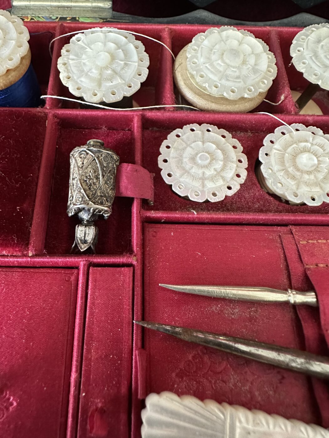 Absolutely the best sewing box we have had for some time. The hinged lid inset with a mother of pearl opening to a fitted interior, with a further miniature inside the lid. It comes complete with various interesting and useful accessories from the Victorian period. Including MOP reel ends and accessories. This unique box is the height of Victoriana. Ht 9, W 27, D 19 cms