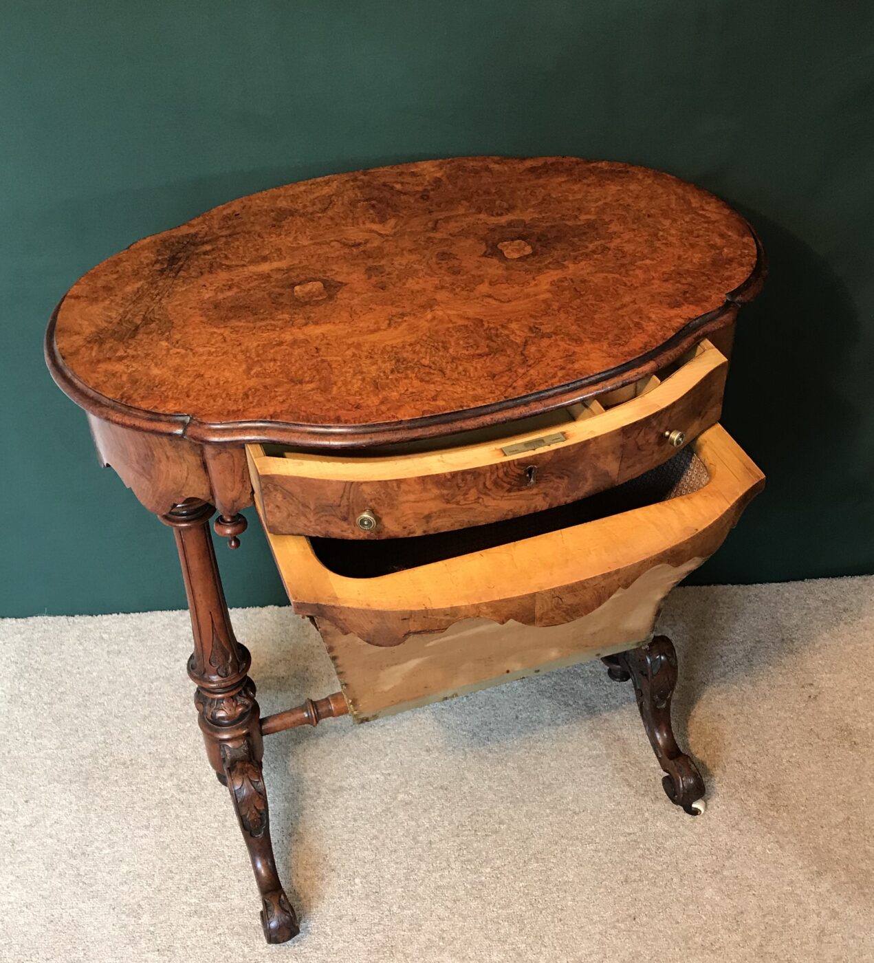 A Victorian burr walnut table of oval outline, fitted with a drawer over a side out well. This table is in amazing original condition , complete with all the finials and porcelain casters. Ht 71, W 66, D 48 cms